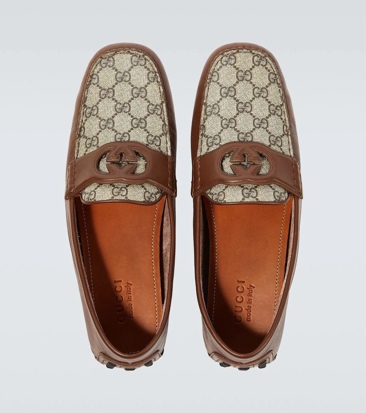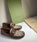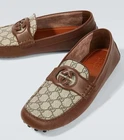 Brand new in box Gucci driver loafers. GG Supreme beige/ebony canvas with brown leather. Cut-out interlocking GG leather detail across the vamp and rubber pebble sole. 100% Authentic. Includes original Gucci box and dust bag as shown in photos. Details: Brand: Gucci Style: Driver Loafer Color: Beige/ebony GG canvas with brown leather trim Material: Canvas and leather upper, leather lining, rubber pebble sole Size: US8.5 UK7.5 Condition: New in box Includes: Original Gucci box and dust bag Made in Italy