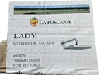 This is a brand new Latoscana Lady 89CR750 square 8-inch chrome shower head that is made in Italy. It is wall-mounted and features a sleek silver chrome finish. The shower head is designed for use in showers and includes a single shower head. With a modern square shape and being low lead compliant, this Italian-made shower head adds a touch of elegance to any bathroom setting.