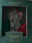 Elevate your holiday decor with the Marquis Waterford Crystal American Santa Ornament, the first in a series of collectibles that capture the spirit of Christmas. Crafted with the meticulous care Waterford is known for, this piece features a charming Santa Claus shape, etched with precision into high-quality crystal. Its clear color and delicate design showcase the craftsmanship from Germany, presenting a touch of elegance to any festive setting. This 3-inch tall ornament is complemented by a width of 2.5 inches, striking the perfect balance for display on your Christmas tree or mantel. As a vintage piece, model 122098 serves as a timeless treasure or a thoughtful gift for collectors and enthusiasts of Waterford crystal ornaments. Embrace the holiday season with this exquisite addition to your Christmas collection. New in Box (may have some shelf wear) No Waterford booklets are included Listing and template services provided by inkFrog