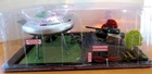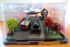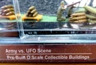 This is a new, sealed, Menards O Scale Limited Edition Army vs UFO Scene Operating Accessory. Fully animated. Tank moves, lights up like you're firing at UFO and makes sounds. Jeep goes up and down. Power supply is sold separately by Menards. Defend your planet! O Gauge War of the Worlds First those rascally Martians came for our cows. Next they raided our supply of tasty M&Ms treats. Now, though, they've gone too far! They are prowling around the Army base, snatching our Jeeps! Heed the bugle call and protect our vehicles from these interplanetary hoodlums! The basics: The Army vs. UFO scene is a fully assembled and decorated 18 x 11-1/4 x 7-1/2 diorama with an illuminated flying saucer equipped with a clamp for raising and lowering a Jeep; soldiers, aliens, military equipment, and a moving tank with flashing cannon, machine guns, and sound effects. Sound effects are triggered with a push button on a two-foot lead. The accessory has a topside power plug-in on the gravel hill, and a second in the base for a connection from beneath the tabletop. This is designed for the Menards Plug & Play power system (sold separately) for operation. Check Menards nos. 279-4061, 279-4062, or 279-4050. You may wish to consider the 8- or 9-piece Plug & Play accessory kits (SKU# 279-4035, 4681) and to serve multiple structures and vehicles. All are available separately.