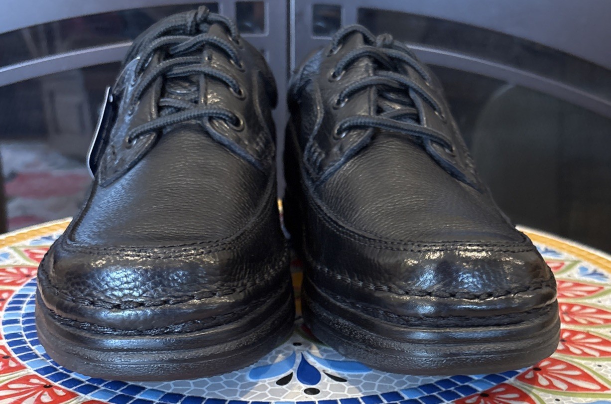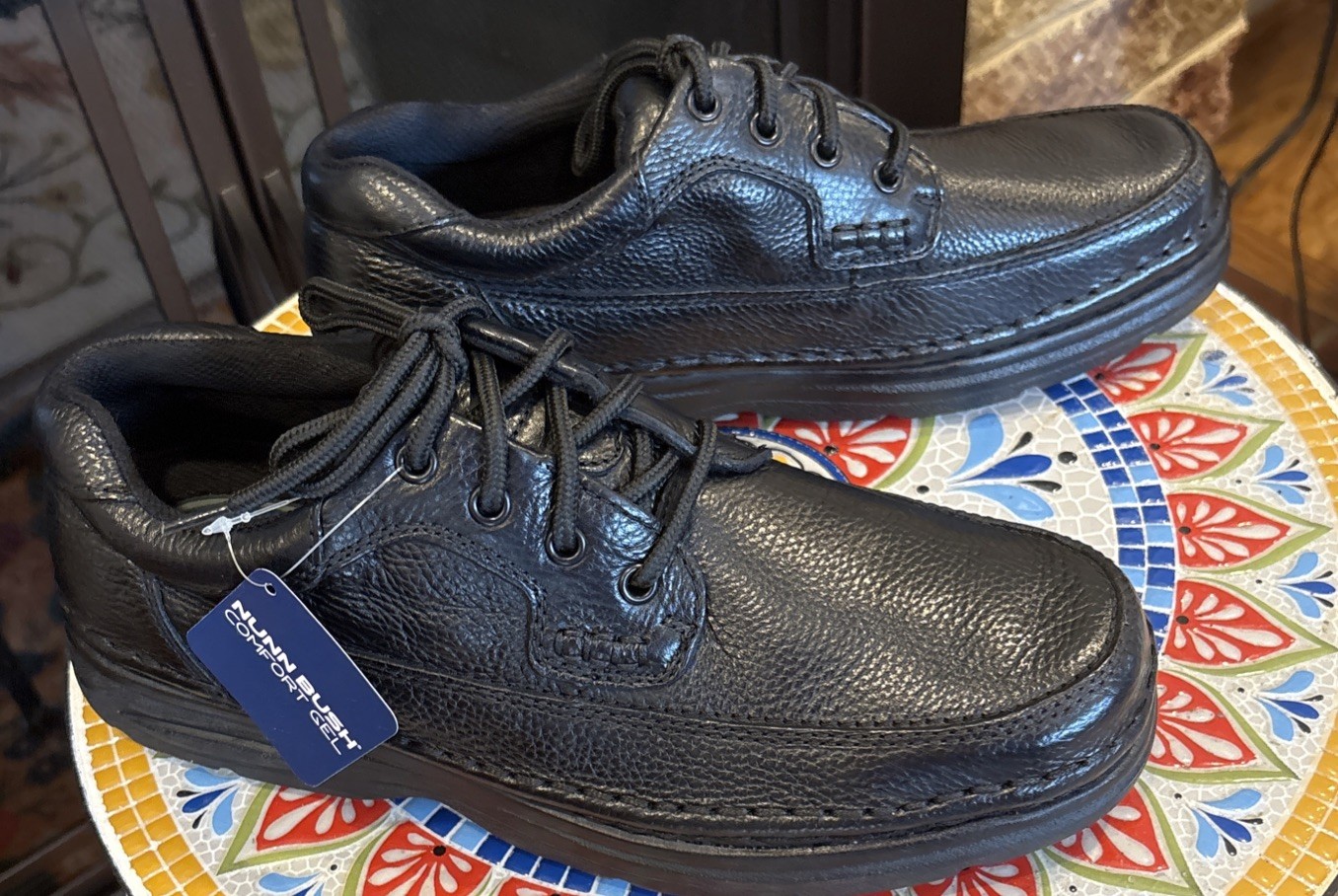 The product is a pair of men's Nunn Bush Cameron black leather Oxford dress shoes in size 10 with a gel cushion for added comfort and support. These lace-up shoes feature a solid black color, round toe shape, and a rubber outsole. They are designed for various occasions such as travel, activewear, casual outings, and workwear. The shoes offer a stylish yet practical look, making them suitable for year-round wear in any season. The Nunn Bush brand is known for quality and durability, making these shoes a reliable choice for any man's wardrobe. These will come in their original box, which will also be used as the shipping box.