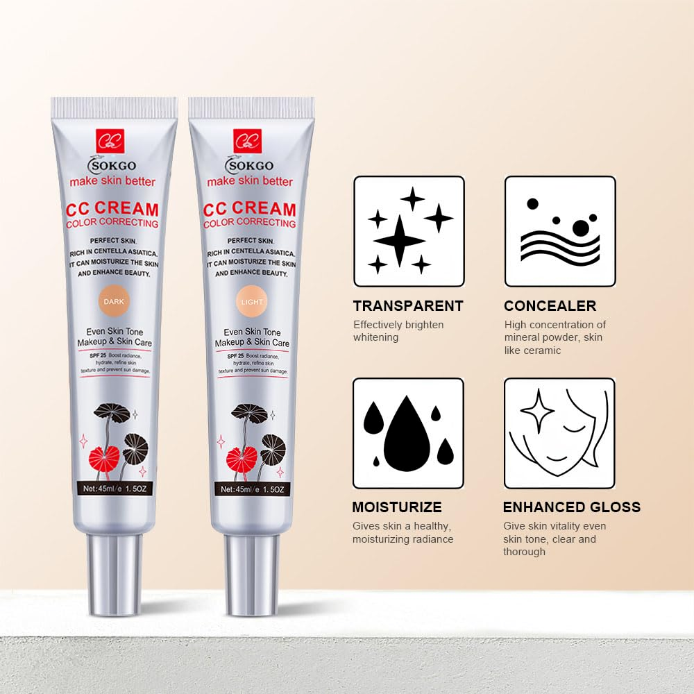 About this item 1. Refreshing texture: It smells good, with a faint plant fragrance. The texture is Refreshing and easy to apply. It is a white lotion at the beginning, and it will change color after even application. The color can fit the skin tone very well, and it will not sticky or creasing, just like the skin that grows naturally. 2. Moisturizing effect: Color Correcting CC Cream can moisturize the skin, improve skin condition, enhance skin radiance, and make skin younger and more energetic. 3. Full-Coverage Foundation: Color Correcting CC Cream can be used as a primer before makeup, has a strong concealing power, and can correct various blemishes such as skin redness and acne marks. Can make the skin look flawless and better restore the original beauty of the skin. 4. Sun protection, Color Correcting CC Cream has sun protection effect, SPF 25, omits the step of applying sunscreen, and makes the makeup look better, Available in dark shades to adjust to your skin tone depending on the temperature of application. 5. Diversified functions: Color Correcting CC Cream suitable for lazy people, create a translucent base makeup in one step, save multiple makeup steps, and make going out quick and easy. It's so easy to use, even a novice can create the perfect base. Make it easier to be beautiful. Product Description Correct your skin tone and create a light and transparent makeup easily Conceal your pores, cover your blemishes, and create a naturally perfect skin condition Moisturizing, lightweight creamy texture Refuse mask face, you only need a Color Correcting CC Cream, a must-have product for clear nude makeup, making you feel as moist as spring in winter Waterproof and sweatproof, the effect is long-lasting, so that the base makeup "doesn't change" all day long Rejuvenate the skin and let the beauty bloom How to use: After basic skin care, apply a thin layer with fingers to the skin at the last step, then watch the formula warm to your skin and adjust to your skin tone.