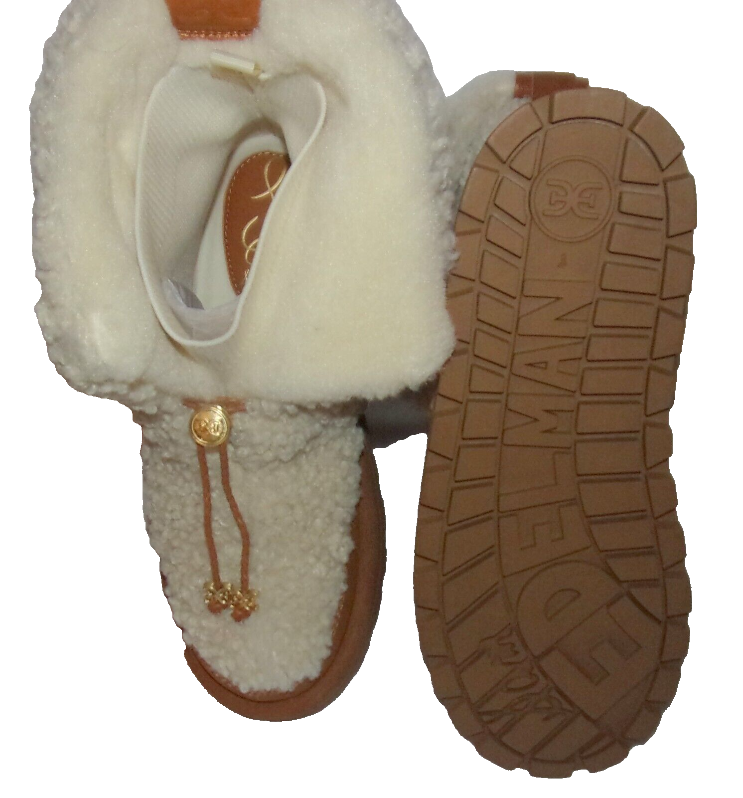 NIB Sam Edelman Olin Natural Brown Shearling Lug Sole Ankle Boots 8 M A foldover cuff plays up the casual vibes of a stylish short bootie grounded by a lug sole. 7 1/2" shaft Pull-on style; elastic laces with adjustable toggle closure Synthetic and textile or synthetic, textile and synthetic faux-fur upper/textile lining/synthetic sole Imported