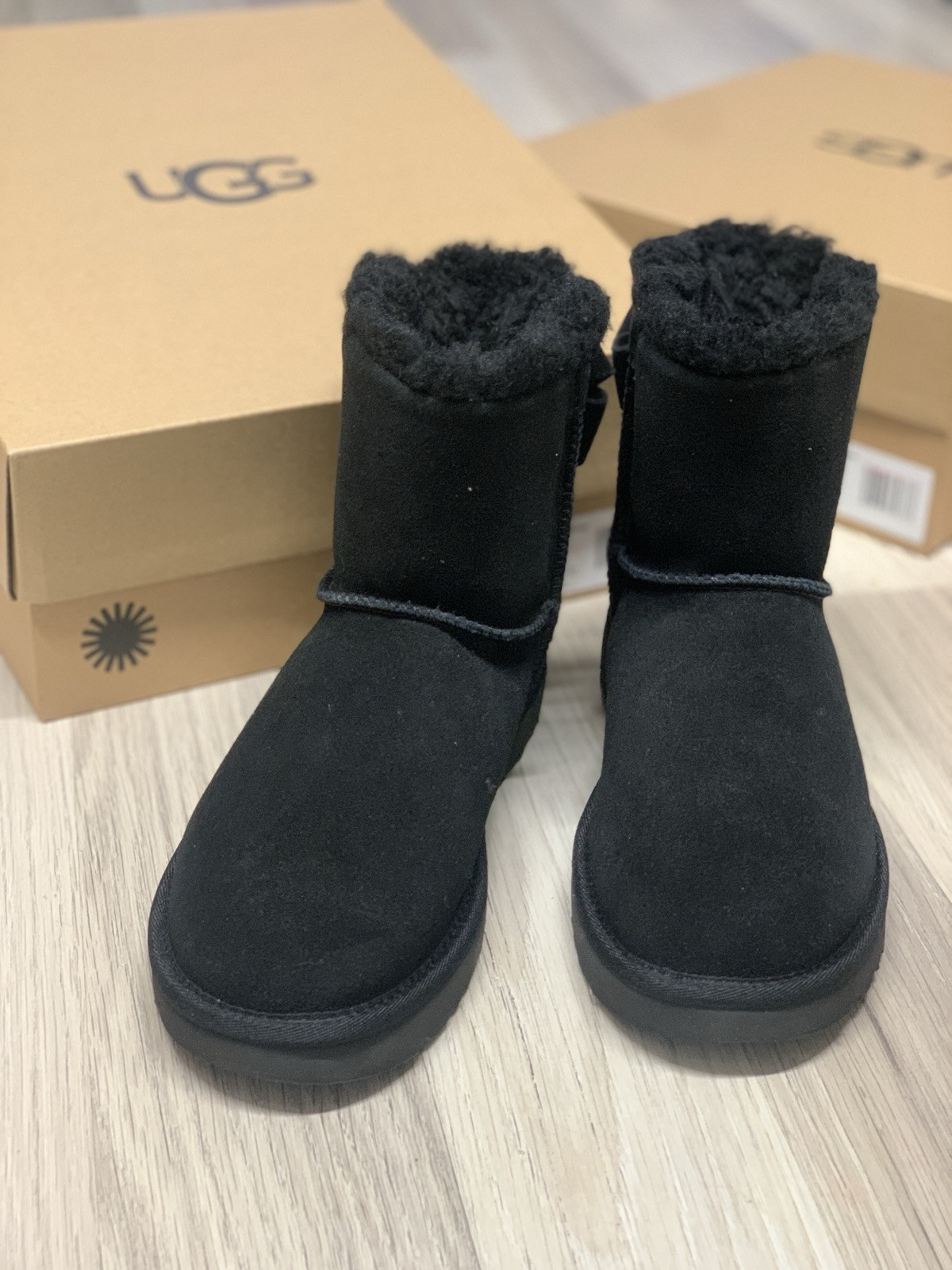 UGG MINI BAILEY SUEDE BOW BLACK SHEEPSKIN SHORT BOOTS SIZE US 5 WOMEN NEW With BOX STYLE# 1153534 A suede bow adorns the back of a supremely cozy boot made from plush genuine shearling. Now pretreated to repel water and stains, the boot also features a new Treadlite by UGG™ sole for added cushioning, traction and durability. DESCRIPTION: Pull-on style Fixed suede bow along back shall 17mm UGGplush™ 80% upcycled wool, 20% lyocell lining 17mm UGGplush™ 80% upcycled wool, 20% lyocell sockliner Treadlite by UGG™ outsole provides increased traction, durability, cushioning and flexibility. Imported. Women's Shoes.