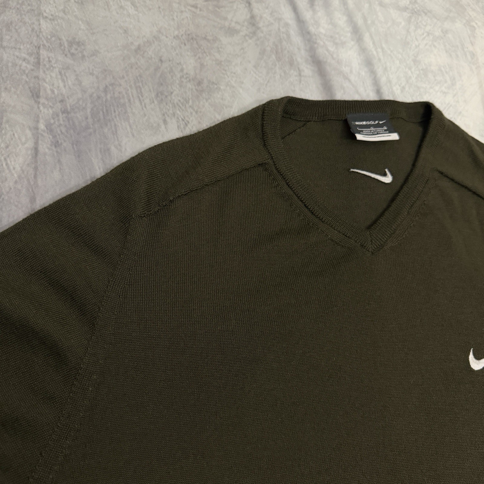 The NIKE Golf Sweater is a stylish and versatile pullover jumper in dark olive color, perfect for various occasions including casual outings, formal events, and even business meetings. Made from a wool blend fabric with a tight-knit design, this sweater is lightweight, breathable, and suitable for all seasons. The V-neckline, long sleeves, and embroidered logo accents add a touch of sophistication to this classic and timeless piece from Nike, making it a must-have addition to any man's wardrobe. Ideal for outdoor activities like walking and golf, this sweater is both practical and fashionable. Minor signs of wear no major flaws Last photo for color comparison Feel free to message with questions or offers