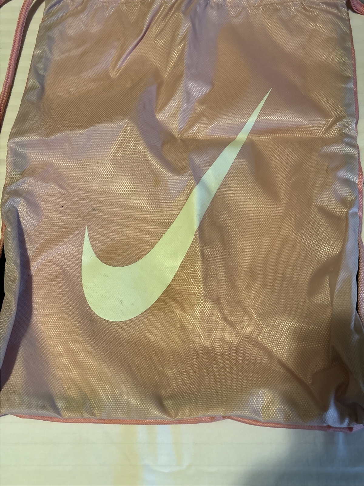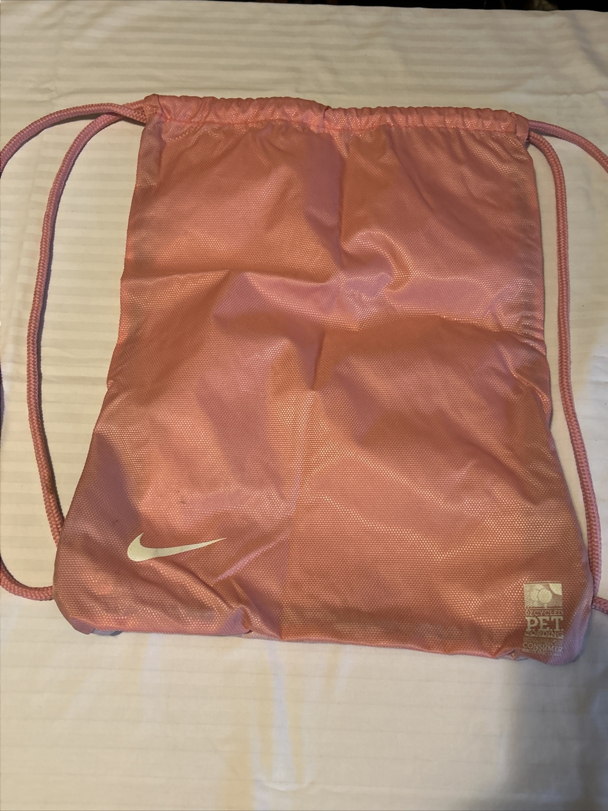 This NIKE gym sack backpack is perfect for any woman on the go. With a drawstring closure, this bag is both lightweight and easy to carry. Measuring 13 inches in width and 17 inches in height, it's the perfect size for a medium load. The exterior is made of a combination of polyester and acrylic, with a stylish pink and white swoosh design. The pink hardware and drawcord add a nice touch of color. Inside, the lining is also pink. It's a great addition to any collection and perfect for the gym, school, or simply running errands. Thank you for looking, and please continue to check out for the proof for great deals as I do combine shipping and I will send you an invoice if you purchase more than one listing! Happy shopping!