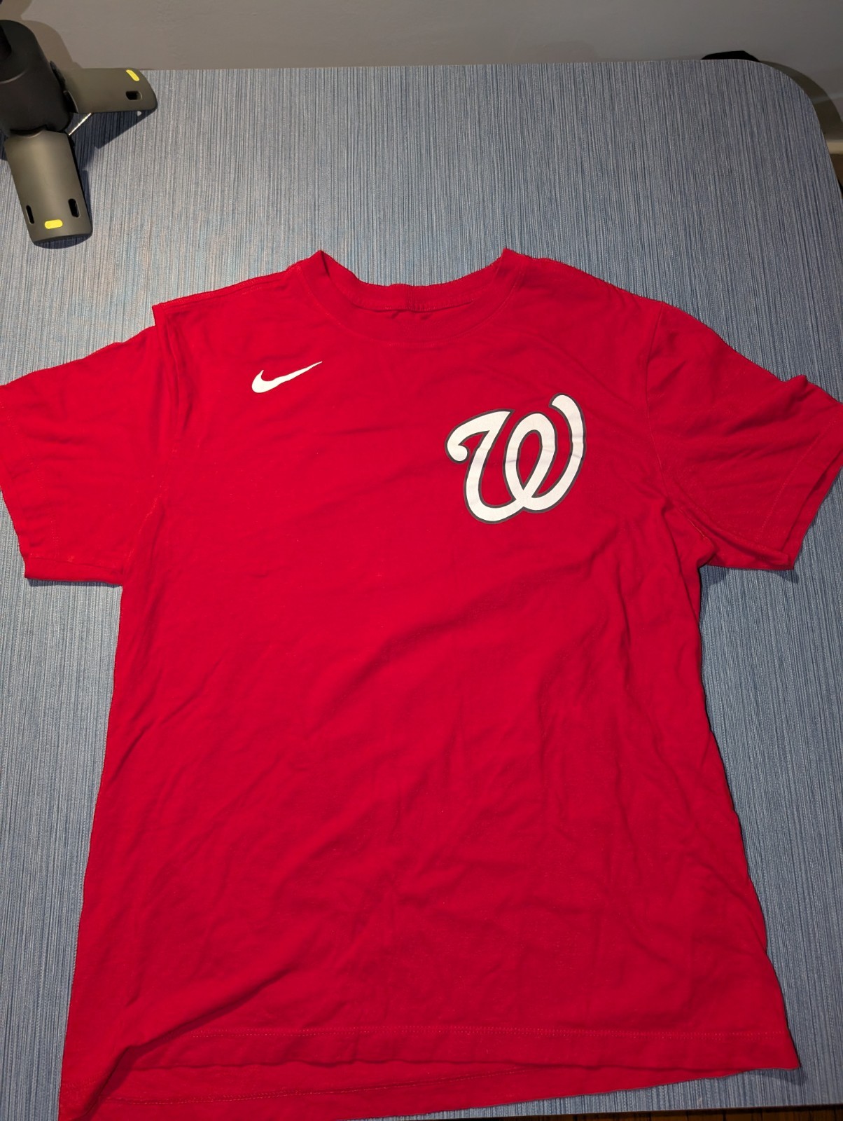Show your support for the Washington Nationals with this Nike Soto T-shirt! Featuring the standout player Juan Soto, this shirt is perfect for any baseball fan. The shirt is officially licensed and made for regular season games. With a capacity of 8 oz, this size M shirt is perfect for game day or everyday wear. The shirt comes in a multi-color design and is made for men. It's short-sleeved and made with high-quality materials. Whether you're a fan of the Nationals or just a fan of baseball, this shirt is a must-have addition to your collection.
