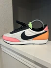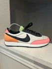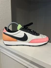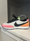 Nike Women's Daybreak Summit sneakers in white with a sunset pulse neon accent. These athletic sneakers in size 8.5 feature the classic waffle design and are part of the Nike Daybreak product line. The style code is DJ5996-100, and the model is NIKE DAYBREAK SUMMIT. Perfect for women looking for a stylish and comfortable sneaker option.