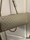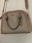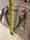 The Nine West Women's Satchel Logo Design Tote is a stylish and versatile handbag that is perfect for various occasions including travel, casual outings, workwear, and business meetings. This medium-sized bag features a zip closure, double pink handles, and a detachable crossbody strap for added convenience. The satchel design in beige and pink colors with gold hardware accents gives it a chic and sophisticated look. Made from faux leather with a fabric lining, this bag is durable and easy to care for. The adjustable strap adds a practical touch to this fashionable accessory. Only worn once.