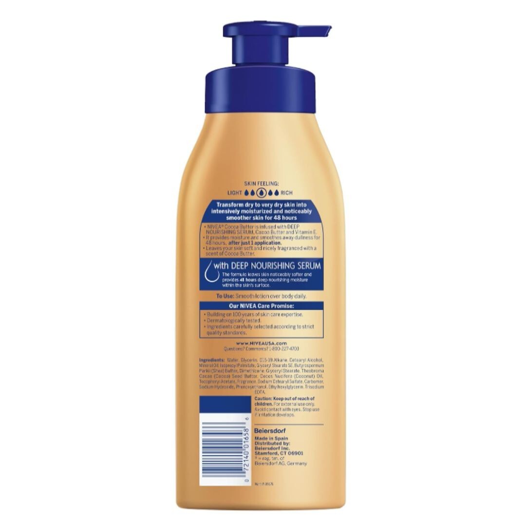 About this item Product details Reveal soft, radiant looking skin with NIVEA Cocoa Butter Body Lotion. This daily body lotion for dry skin nourishes dry skin for visible radiance and provides 48 hour deep nourishing moisture. The NIVEA cocoa butter lotion is infused with Deep Nourishing Serum, cocoa butter and Vitamin E, for healthy looking skin and lovely cocoa butter scent. The dry skin lotion smoothes away dullness after just one application. NIVEA is proud to be one of the leading companies in the field of skin care products, with more than 100 years of experience. NIVEA lotion with cocoa butter is a key part of a skincare routine and pairs well with NIVEA Body Wash as part of a daily skin care regimen. This body lotion is ideal for those with very dry skin, and can also be used as a hand lotion or foot lotion. To use, apply NIVEA Cocoa Butter Body Lotion daily. One 16.9 fluid ounce pump bottle of NIVEA Cocoa Butter Body Lotion Cocoa butter lotion nourishes dry skin for visible radiance and provides 48 hours of deep nourishing moisture Scented lotion infused with NIVEA Deep Nourishing Serum, cocoa butter and Vitamin E for healthy looking skin NIVEA Cocoa Butter Body Lotion is ideal for those with very dry skin, and can also be used as a hand lotion or foot lotion Lotion pump bottle makes this NIVEA body lotion a convenient addition to your home or office To use, pump lotion and smooth over body; apply body lotion daily for best results NIVEA is a trusted leader in skin care products, with more than 100 years of experience More details Skin Care Key Benefits Moisturizing Scent Cocoa Butter Body Part Body Brand Unbranded Assembled Product Weight 1.246 lbs Manufacturer Beiersdorf Features Vitamin Enriched Gender Unisex Age Group Adult Assembled Product Dimensions (L x W x H) 1.97 x 3.27 x 9.45 Inches