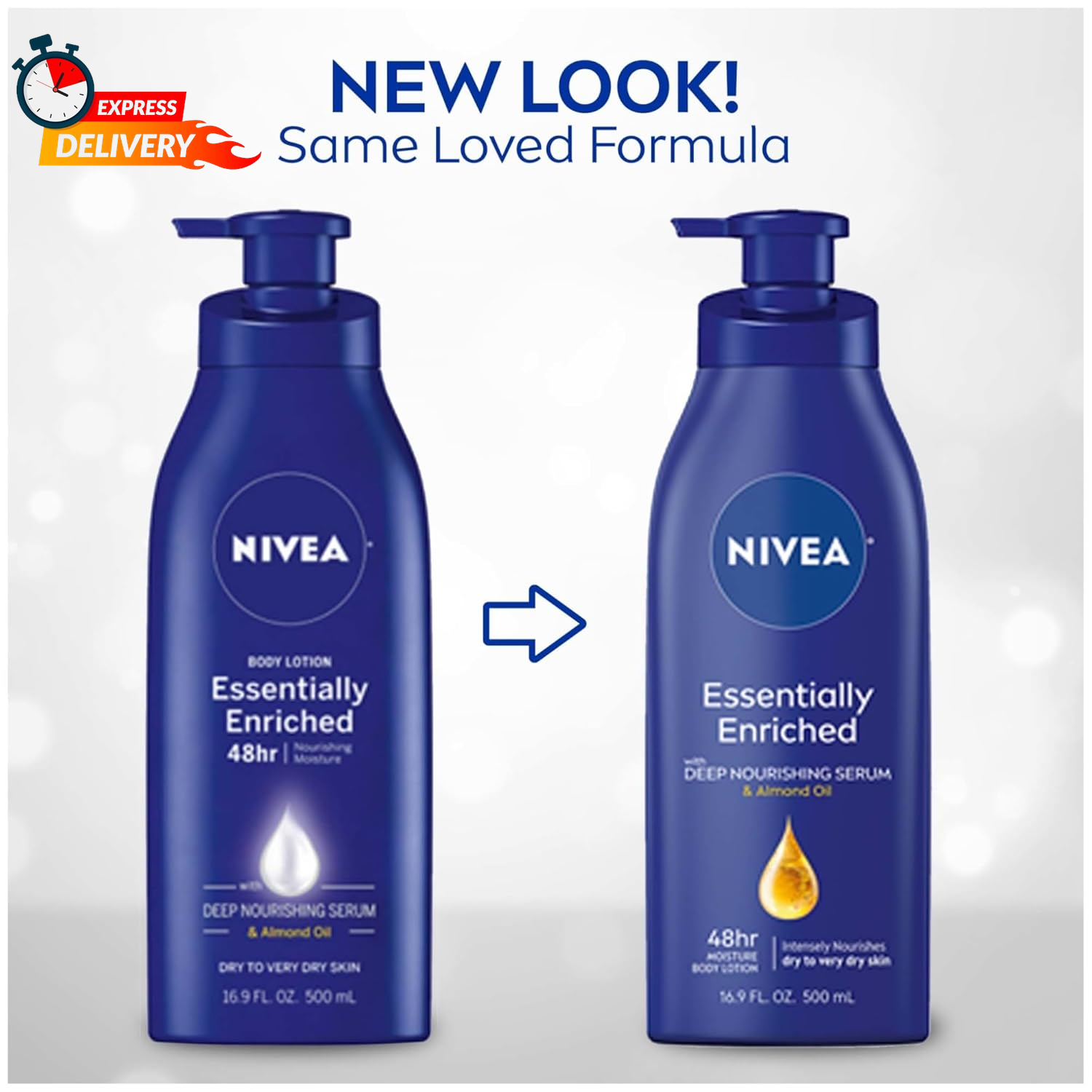 Store New Arrivals Add to Favorite View Feedback Contact NIVEA Essentially Enriched Body Lotion for Dry Skin, Pack of 2, 16.9 Fl Oz Pump Bottles Description Item model number 072140023973 Item dimensions L x W x H 4.37 x 4.13 x 10.5 inches Item Volume 33.8 Fluid Ounces Product Dimensions 4.37 x 4.13 x 10.5 inches; 2.11 Pounds Style 16.9 Fl Oz (Pack of 2) Age Range (Description) Adult Special Feature Nourishing Brand NIVEA Manufacturer Beiersdorf, Inc. 48 Hour Deep Nourishing: This NIVEA body lotion for dry skin and very dry skin provides 48 hours of deep nourishing moisture Smoother Skin: Infused with Deep Nourishing Serum and Almond Oil for skin, it reduces roughness after just one application Tested & Trusted: NIVEA Essentially Enriched lotion is dermatologically tested, and is ideal for those looking for a daily lotion for very dry skin Convenient Pump Bottle: NIVEA dry skin lotion pump bottle is a convenient option for home or office use Includes two (2) 16.9 fluid ounce pump bottle of NIVEA Essentially Enriched Body Lotion BULK LOTION PACK INCLUDES: Two 16.9 fluid ounce bottles of NIVEA Essentially Enriched Body Lotion, New Look and Formula With NIVEA Essentially Enriched Body Lotion, nourished and deeply moisturized skin is not as far away as you think. This body lotion for dry skin and very dry skin is infused with NIVEA Deep Nourishing Serum and Almond Oil to nourish by locking in deep moisture. NIVEA Essentially Enriched Body Lotion reduces the roughness of skin, after just 1 application. With a formula that provides 48 hours of deep nourishing moisture, this dry skin lotion locks in moisture and gives noticeably smoother skin. NIVEA is proud to be one of the leading companies in the field of skin care products, with more than 130 years of experience. Daily body lotion use is a key part of a skincare routine and this product pairs well with NIVEA Body Wash as part of a daily skin care regimen. This body lotion can also be used as a hand lotion or foot lotion. To use, smooth NIVEA Essentially Enriched lotion over body, apply daily. ABOUT US We offer the best prices around on high quality products. Our E-store includes media such as books, movies, music and games while offering electronics, toys, sporting apparel, clothing, tools, general home, garden items and more. SHIPPING We are always working hard to ensure your package arrives as soon as possible. Please understand that some factors like weather, high postal traffic, and the performance of shipping companies are outside of our control. We offer free shipping to the lower 48 states and ship within 2 business days of payment, usually sooner. We do not accept P.O. Boxes. Please provide a physical address. For shipping outside of the continental USA, we only use eBay's Global Shipping Program.The item is shipped to KY and then sent to the rest of the world. International customers are responsible for all duties and taxes. Continue to check out in order to calculate costs for shipping the item to your country. Messages regarding eBay's Global Shipping Program MUST be directed at eBay EXCLUSIVELY. RETURNS We offer a 30-Day Return Policy on items which you are not completely satisfied with. You have the option for a full-refund or an exchange of the item. No returns are available on items shipped outside of the USA. PAYMENT We accept PayPal. CONTACT US This page content is yet to come Please ad us to your favorite seller and visit again later Thank You CUSTOMER SATISFACTION We try our very best to make sure every customer is completely satisfied. If there's a problem, message us! We're happy to help. WE ACCEPT Copyright © 2021 AutoDS. | All Rights Reserved
