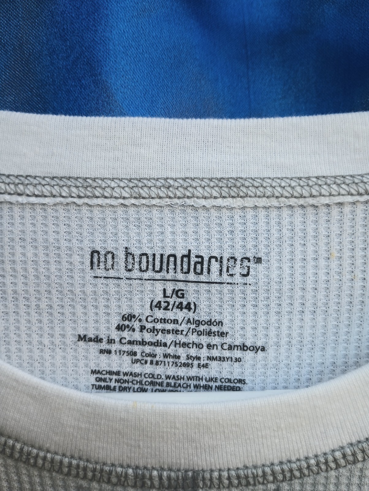The NOBO Y2K Men's Vintage White L Shirt is a long sleeve graphic print T-shirt featuring a grunge, skull, and cross wings design. Made of cotton knit fabric, this regular fit shirt is machine washable and suitable for winter and spring seasons. With a crew neck and thermal features, this vintage shirt from the year 2000-2009 is a stylish addition to any man's wardrobe. Perfect for skater and grunge enthusiasts, this No Boundaries brand shirt is a must-have for those looking to add a unique and edgy touch to their look.