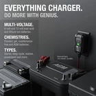 Meet the NOCO GENIUS1, one of our most powerful, highest-performing, energy-efficient, and compact portable universal battery chargers yet. The GENIUS1 is a 1-amp (15-watt) - 100-240VAC 50-60Hz - 6-volt and 12-volt heavy-duty battery charger, battery maintainer, trickle charger, float charger, and battery desulfator for up to 30 amp-hours. It's designed to charge and maintain all types of sealed lead-acid and lithium-ion (lifepo4) batteries, including flooded, gel, maintenance-free, AGM, SLA, VRLA, as well as automotive, marine, RV, powersports, and deep-cycle batteries. Its advanced battery repair regenerator mode uses slow pulse reconditioner technology to automatically detect battery sulfation and acid stratification, restoring lost battery performance for extended battery life. It can be used and stored almost anywhere - home, garage, mobile, bench, or in car - to charge and maintain any battery - even plug in through your vehicle's 12V auxiliary cigarette lighter port. Its next-generation charging regime utilizes fast charging microprocessor technology to rapidly recharge batteries without any manual intervention. It's a completely automatic, worry-free, professional, and commercial-grade intelligent battery charger with zero overcharge. Designed to be dual purpose - both indoors and outdoors - providing weatherproof and waterproof protection from the outside elements during any time of the year, including winter. Its X-Connect battery connectors - better than SAE - allow for quick-connect permanent connection or connecting directly to the battery terminals. A digital display provides the charging status and tests diagnostics for multiple conditions such as a dead battery, bad battery, reverse polarity, and more. Meet the NOCO GENIUS1 - Similar to our G750, just better. It's 35% smaller and delivers 35% more power. It's the all-in-one universal charging solution - battery charger, battery maintainer, trickle charger, float charger, plus battery desulfator. Do more with Genius - Designed for 6-volt and 12-volt sealed lead-acid automotive, marine, RV, powersport, and deep-cycle batteries, including flooded, gel, AGM, SLA, VRLA, and maintenance-free, plus lithium-ion batteries (lifepo4). Enjoy precision charging - An integrated digital thermal sensor detects the outside ambient temperature and alters the charge to eliminate over-charging in hot climates and under-charging in cold climates. Charge dead batteries - An intelligent start-voltage sensor detects and charges batteries as low as 1-volt or manually turn on Force Mode to begin fast charging dead batteries down to zero volts. Restore your battery - An advanced battery repair mode uses slow pulse reconditioner technology to automatically detect battery sulfation and acid stratification to restore lost battery performance for stronger engine starts and extended battery life. Beyond maintenance - It's not just an auto battery trickle charger, it's an advanced car battery charger maintainer. A fully-automatic, worry-free portable automotive battery charger for everyday use - 24/7 - with zero overcharge. Compatible with all types of gas and diesel vehicles - Charge and maintain cars, automobiles, motorcycles, dirt bikes, scooters, lawn mowers, ATVs, UTVs, tractors, trucks, trailers, SUVs, RVs, campers, boats, PWCs, jet skis, wave runners, snowmobiles, golf carts, generators, classic cars, and more.