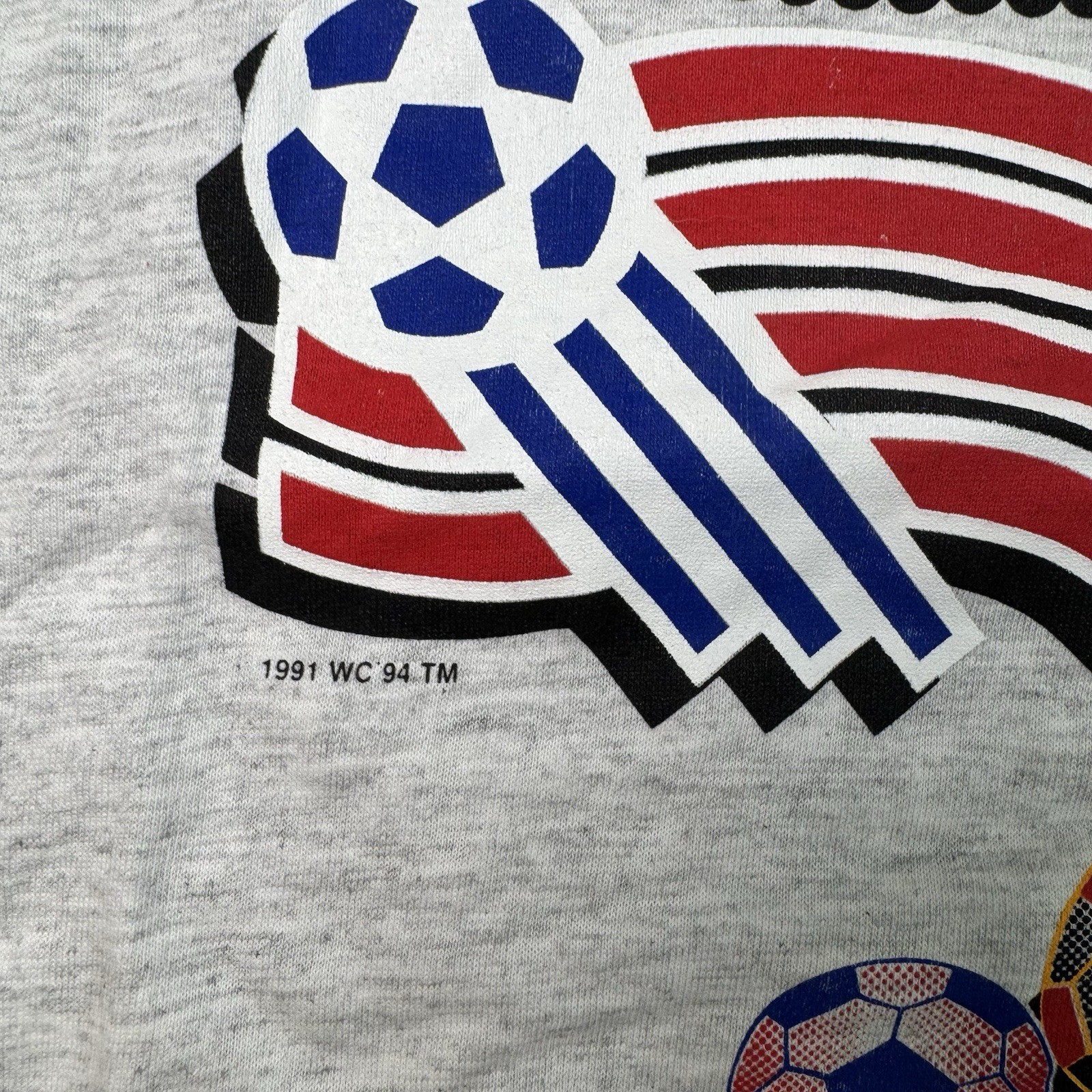 Celebrate global football history with this deadstock 1994 World Cup USA tee, featuring a vibrant multicolor print of all participating countries and official tournament branding. This is an officially licensed product, tagged 1991 WC 94 TM, and printed on a premium Made in USA Screen Stars Ultra ringer tee with a single stitch hem and contrasting double collar. This vintage piece is new old stock with original tags attached—a rare find for collectors, soccer fans, and vintage sportswear enthusiasts. With Copa América 2024 and the 2026 World Cup on the horizon, demand for vintage soccer apparel is surging. Get ahead of the trend. Details: • Brand: Screen Stars Ultra • Size: XL (22.25” pit to pit / 32.5” length) • Material: 100% preshrunk cotton • Color: Heather grey with black collar • Condition: New with tags – never worn • Features: • Officially licensed 1994 World Cup product • Single stitch hem • Double collar (ringer style) • Front graphic with 24 participating countries • Tag year: 1991 WC94 TM • Made in the USA Measurements (laid flat): • Chest (pit to pit): 22.25” • Length: 32.5” • Shoulder: 19.75” • Sleeve: 10.25”