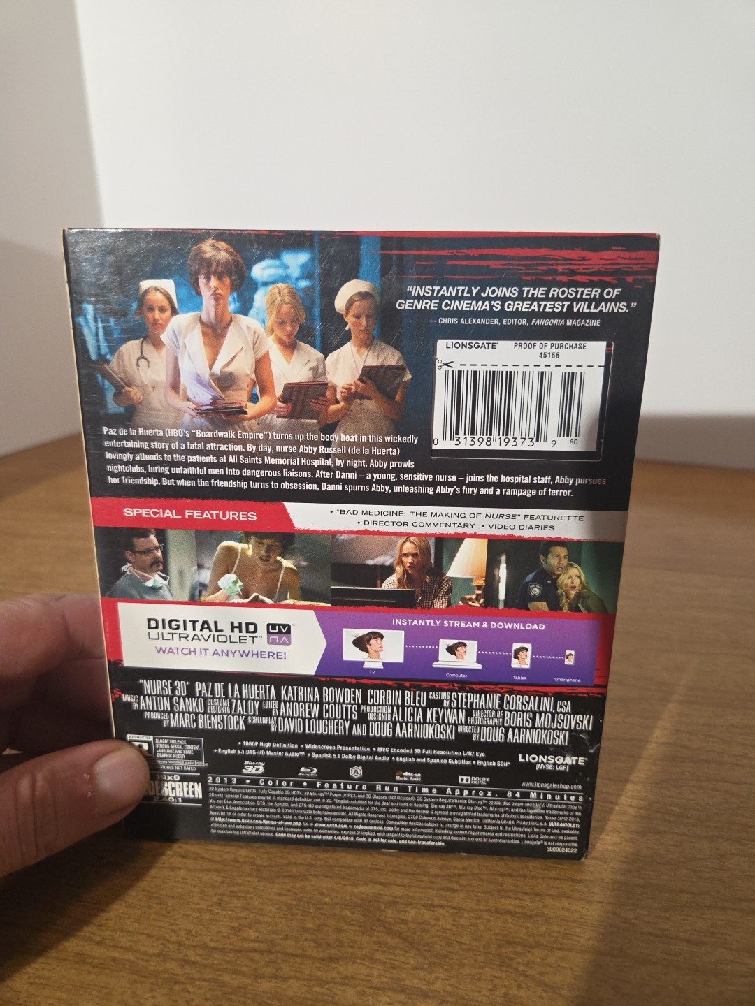 The product is a Blu-ray 3D movie titled "NURSE" starring Paz De La Huerta. Directed by Doug Aarniokoski, this horror film was produced by John Sacchi and March Bienstok. The Blu-ray comes in a case with English and Spanish subtitles, and has a run time of 84 minutes. The disc is from the studio LIONSGATE and was released in 2013. This Like NEW Blu-ray also includes a slipcover but does not come with a digital copy.