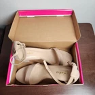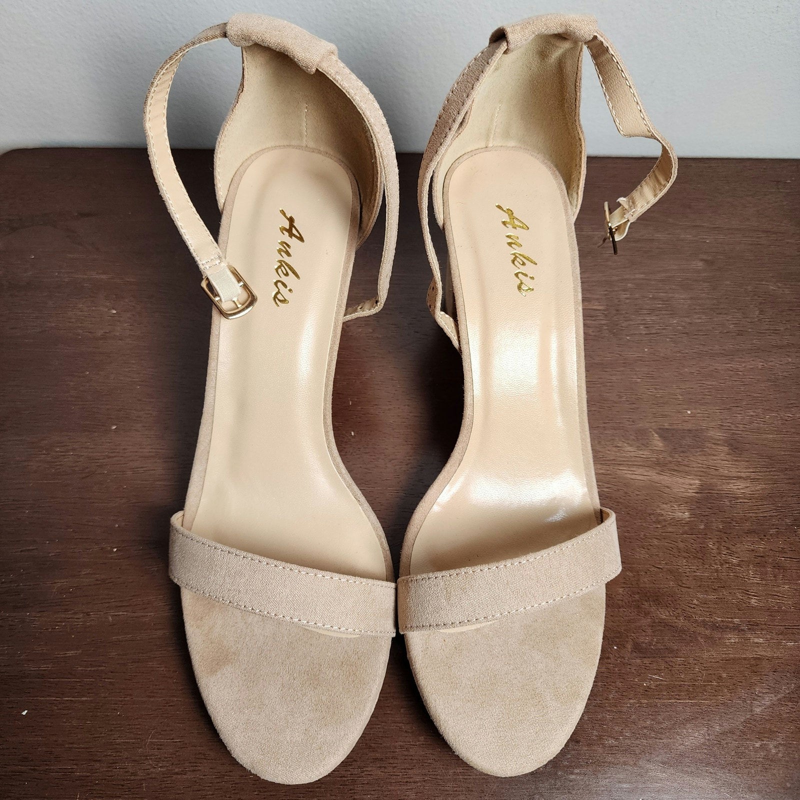 New in box (please note these had been tried on at store which left some marks on bottom) Ankis Sz 8.5M nude faux suede basic ankle strap open toe block heels. Tqgs: Minimalist, Bridesmaid, Prom, Summer, Neutral, Event