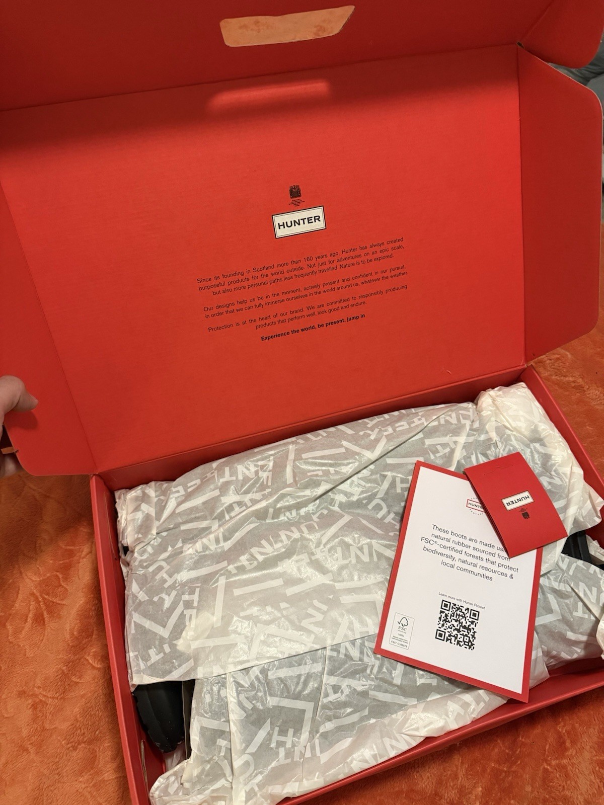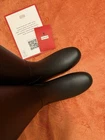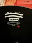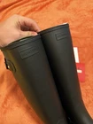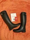 The product is a pair of NWB Hunter Women's Refined Eyelet Gold Buckle Tall Boots in size US 9. These stylish and practical rain boots feature a gold buckle closure and eyelet accents, adding a touch of metal-themed detail to the design. Made with a durable rubber upper material, these boots are perfect for keeping your feet dry and looking fashionable in wet weather conditions. The Hunter brand ensures both quality and style for any woman looking to make a statement with their footwear. Brand new never worn, still have the box. Bought them for my wife but got the wrong size. Retail was $235 before tax.