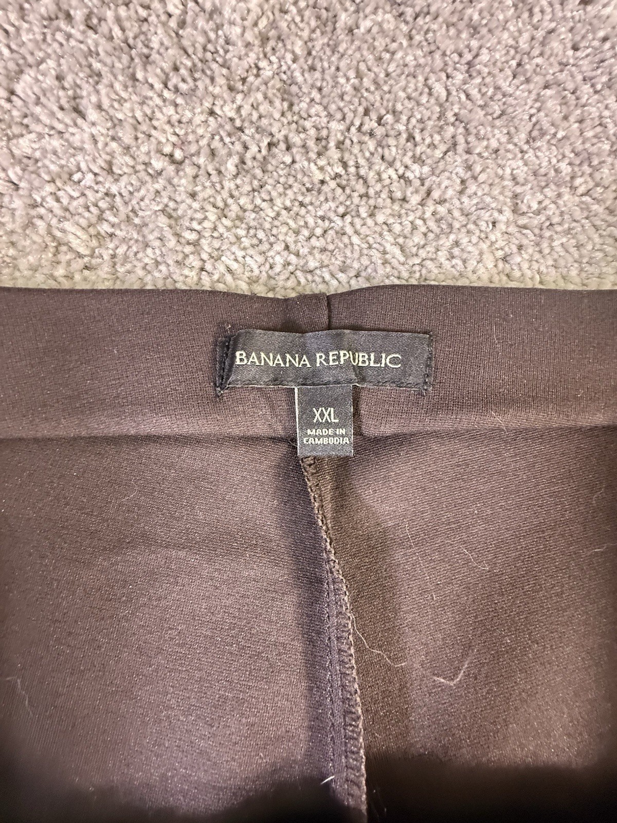 The product is a pair of Banana Republic Women’s Pants in size XXL, featuring a solid brown color with a polyester material. These pull-on pants have a high rise and a regular fit, with a flat front design and ankle length. The pants are machine washable and offer stretch for comfort. Made in Bangladesh, these stylish and versatile pants are perfect for everyday wear. 5042
