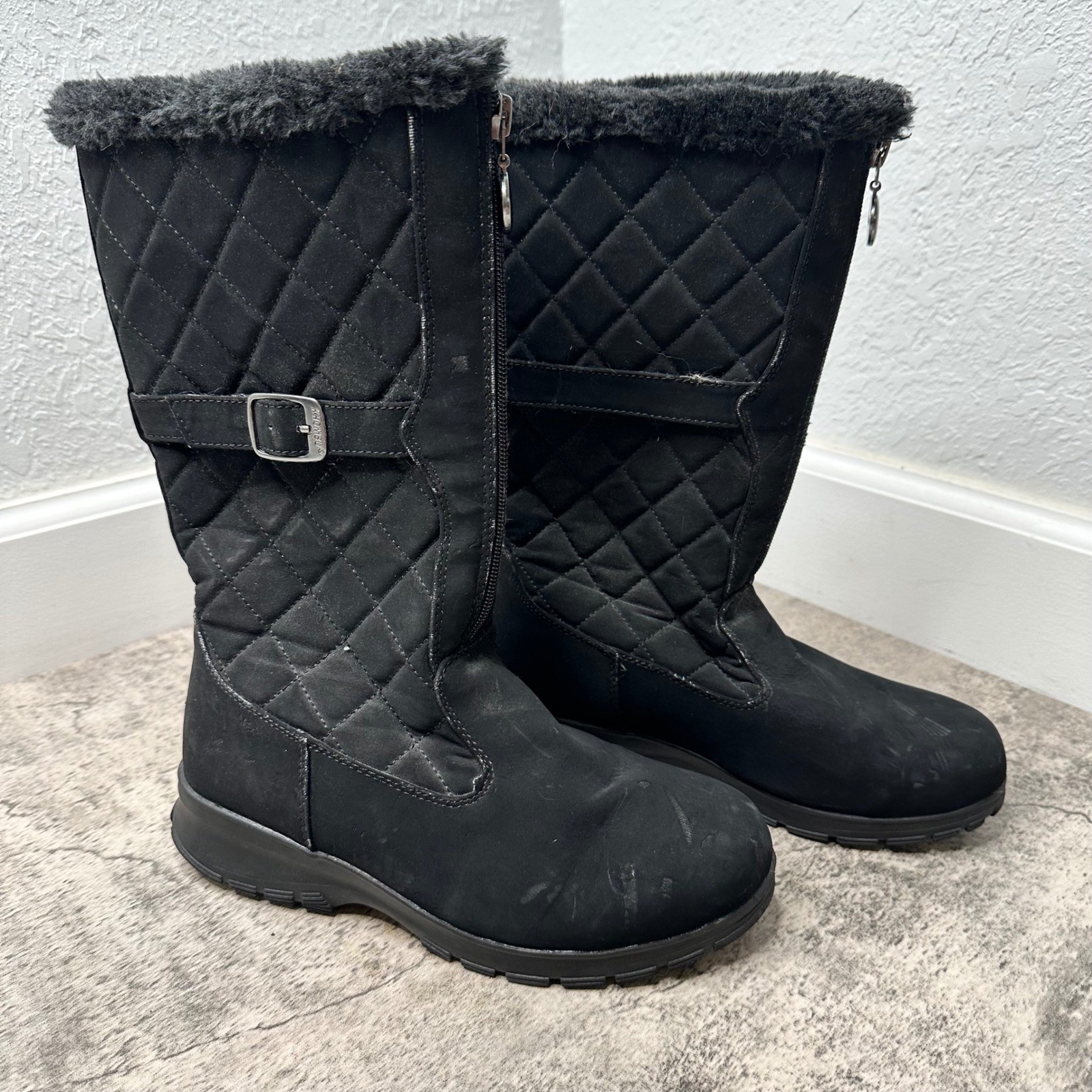 Style: Snow Boot Color: Black Department: Women Upper Material: Suede Shoe Shaft Style: Mid-Calf Heel Style: Flat Occasion: Casual, Travel Lining Material: Faux Fur Insole Material: Fabric Outsole Material: Rubber Toe Shape: Round Toe Heel Height: Flat (Under 1 in) Type: Boot Model: Khombu Quilted Keywords: Khombu boots, winter boots, snow boots, black boots, quilted boots, faux fur boots, buckle boots, women's boots, warm boots, winter footwear, comfortable boots, casual boots, outdoor boots