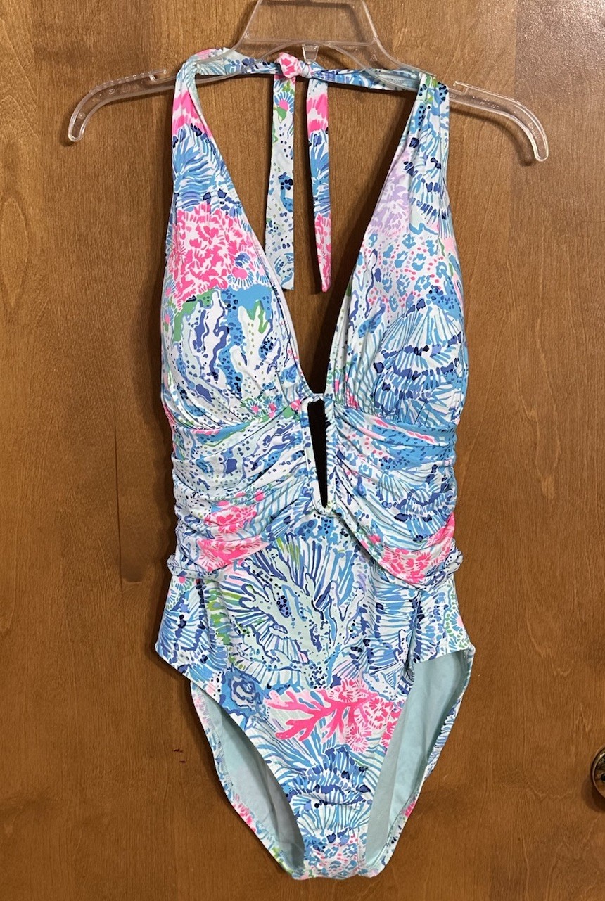 This NWOT Lilly Pulitzer one piece swimsuit in size 16 is a vibrant and stylish option for women looking to hit the beach. Made of durable nylon material, this swimsuit features a halter tie for a comfortable fit. The multicolor Lilly Pulitzer print adds a fun and playful touch, perfect for a day of lounging by the water. Whether you're lounging by the pool or enjoying some time in the sun, this swimsuit is sure to make you stand out with its bold design and adjustable straps.