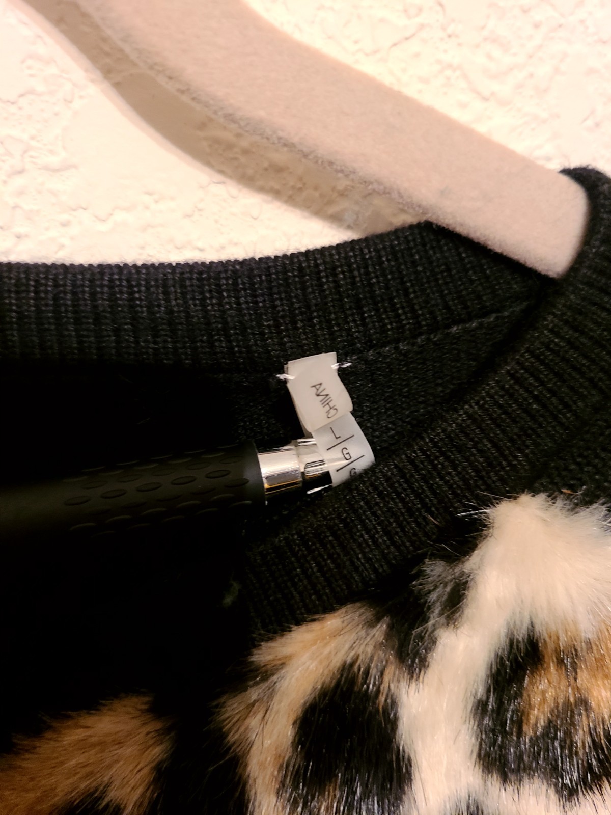 The NWOT T Tahari Black Sweater with Leopard Print Faux Fur in size L is a stylish and versatile piece for any woman's wardrobe. This sweater features a crew neck and long sleeves, perfect for staying warm during the winter and fall seasons. The animal print pattern with faux fur accents adds a touch of wild flair to the design, making it ideal for various occasions such as travel, parties, work, or business meetings. Made with high-quality materials and a comfortable fit, this Tahari sweater is a must-have for those looking to make a fashion statement. Length 25" Armpit to Armpit 21". Faux Fur, leopard print, pullover, soft, city, classic.