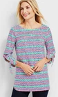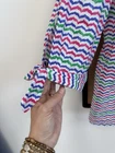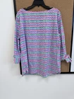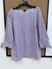 Add a pop of color to your wardrobe with this NWOT Talbots blouse. The bateau neckline and 3/4 sleeves create a versatile look that is perfect for any occasion. The wavy whale-tail stripes and tie closure add a touch of style to this blouse, making it a must-have for any fashion-forward woman. The cotton material is comfortable and durable, ensuring that this blouse will be a staple in your wardrobe for years to come. This blouse is a size XL and comes in a colorful multicolor print.