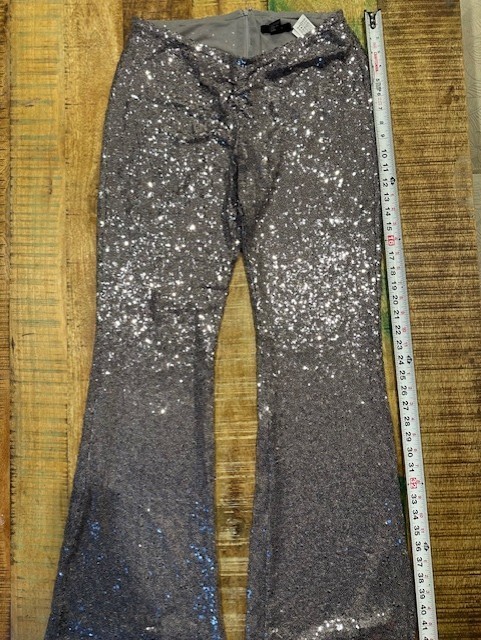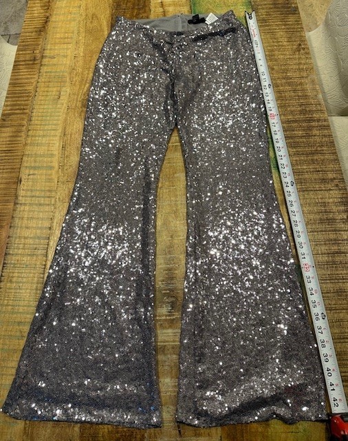 These NWOT Women’s Forever 21 Sequin Pull On Pants in Silver are perfect for a casual occasion with their comfortable and stretchy material. The pants feature a high rise and a relaxed fit, with a wide-leg style and a flat front. The sparkle of the sequins adds a touch of glam to the dress pants, making them a stylish choice for the fall and spring seasons. These pants are a fashionable and trendy addition to any woman's wardrobe.