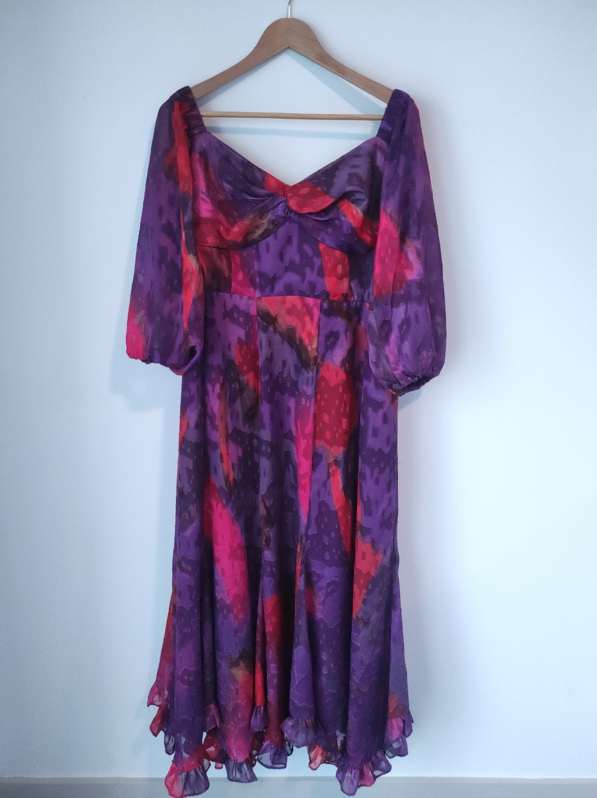 The NWT Anthropologie Hutch Printed Twist-Front Puff-Sleeve Ruffle-Hem Dress in XL is a stylish and versatile piece perfect for various occasions such as weddings, parties, and formal events. This midi-length dress features a sweetheart neckline and puff sleeves, accented with ruffles for added flair. This lined dress is suitable for all seasons, making it a great addition to any wardrobe for the fashion-forward woman. *The dress is new and has both original tags attached. The bottom 2/3rds of the price tag has been cut off.* Original price $228.