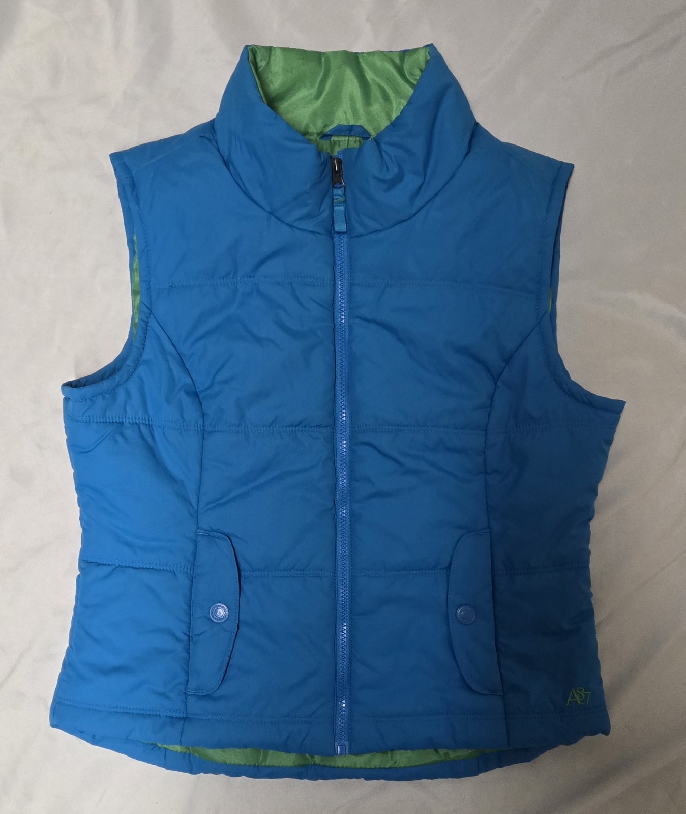 This NWT Aéropostale Women's Large Vest is a stylish and practical addition to any winter or fall wardrobe. The blue polyester outer shell with a green lining and zipper accents adds a fun pop of color to your outfit. The puffer jacket style, along with the pockets, makes it both fashionable and functional for casual occasions. Easy to care for with machine washable instructions, this vest is perfect for staying warm and looking good in cold weather.