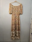 This beautiful maxi dress by Kindred is perfect for any occasion, whether it's a casual day out, a party or even travel. The dress features a stunning floral pattern with ruffle accents and puff sleeves that add a touch of bohemian style. The off the shoulder neckline and smocked details make it a great choice for summer, fall and spring. The dress is made of soft and comfortable rayon fabric, and it is easy to care for as it is machine washable. This dress is perfect for women who love to dress elegantly and comfortably. Get your hands on this NWT dress now and add it to your wardrobe. New with tags Stretch Lightweight 100% Rayon Machine Wash Cold Please see photos for measurements and details :)
