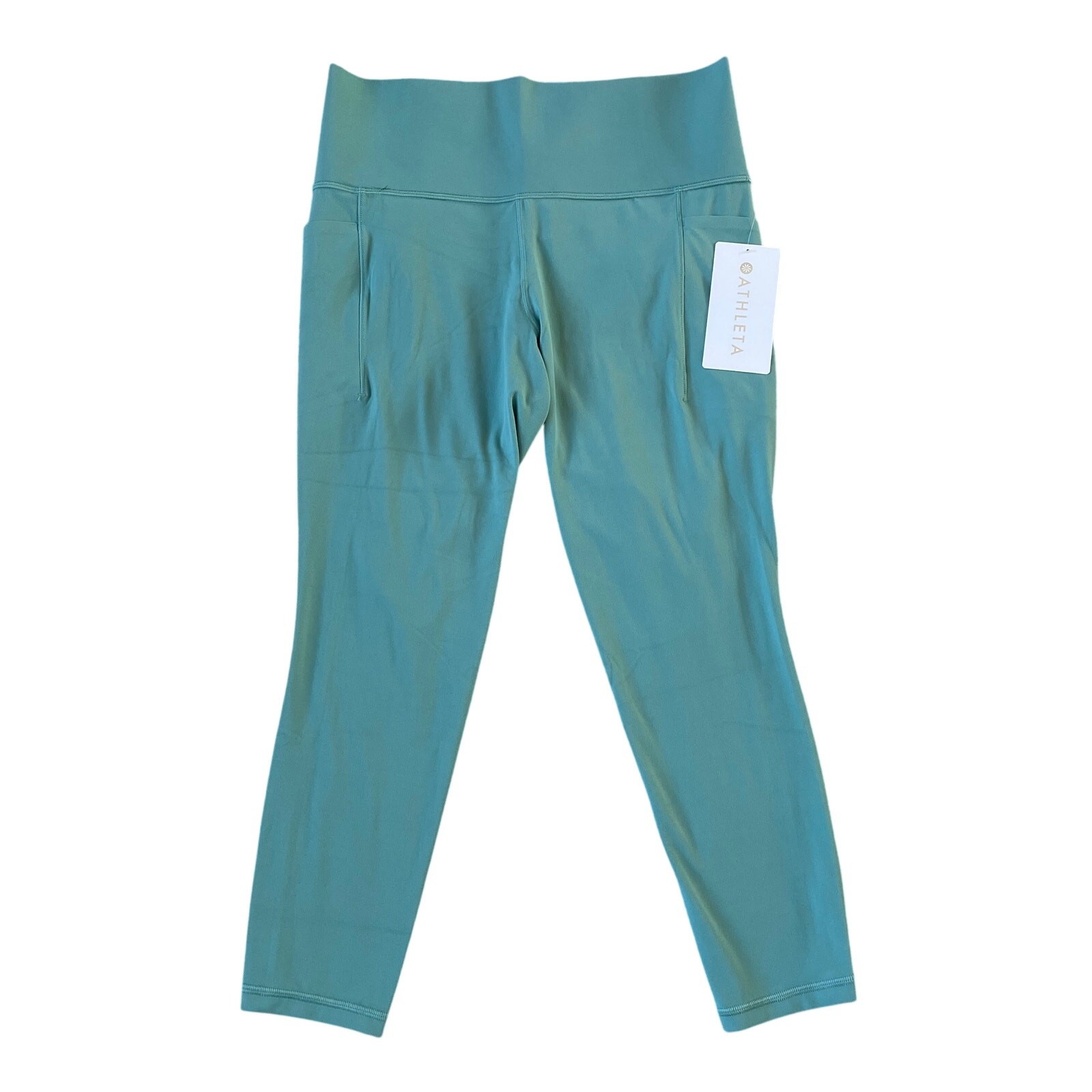 Athleta Salutation Stash High Rise 7/8 Legging in Juniper Teal New with tags No visible flaws Size: Large Color: Juniper Green *Color may differ in photos due to lighting. FOR: Your yoga flow and sessions in the studio. FEEL: Powervita fabric is buttery soft with support that feels like a gentle hug. FAVE: Bonded side stash pockets hold your essentials. Powervita fabric, our yoga leggings/pants are designed for your ultimate distraction-free practice. #531321 Fitted next to the body with a high-rise waistband High rise, sits at the natural waist 75% Nylon/25% LYCRA BREATHABLE: Airflow moves easily through the garment QUICK-DRYING: Dries in a flash for ultimate comfort when breaking a sweat WICKING: Pulls sweat away from the body to the surface of the fabric so it can evaporate RATED UPF 40+ (Excellent Protection) Machine wash and dry. Measurements (laid flat across): Rise: 10" Inseam: 22" Waist (across): 15.5" Total Length: 32"