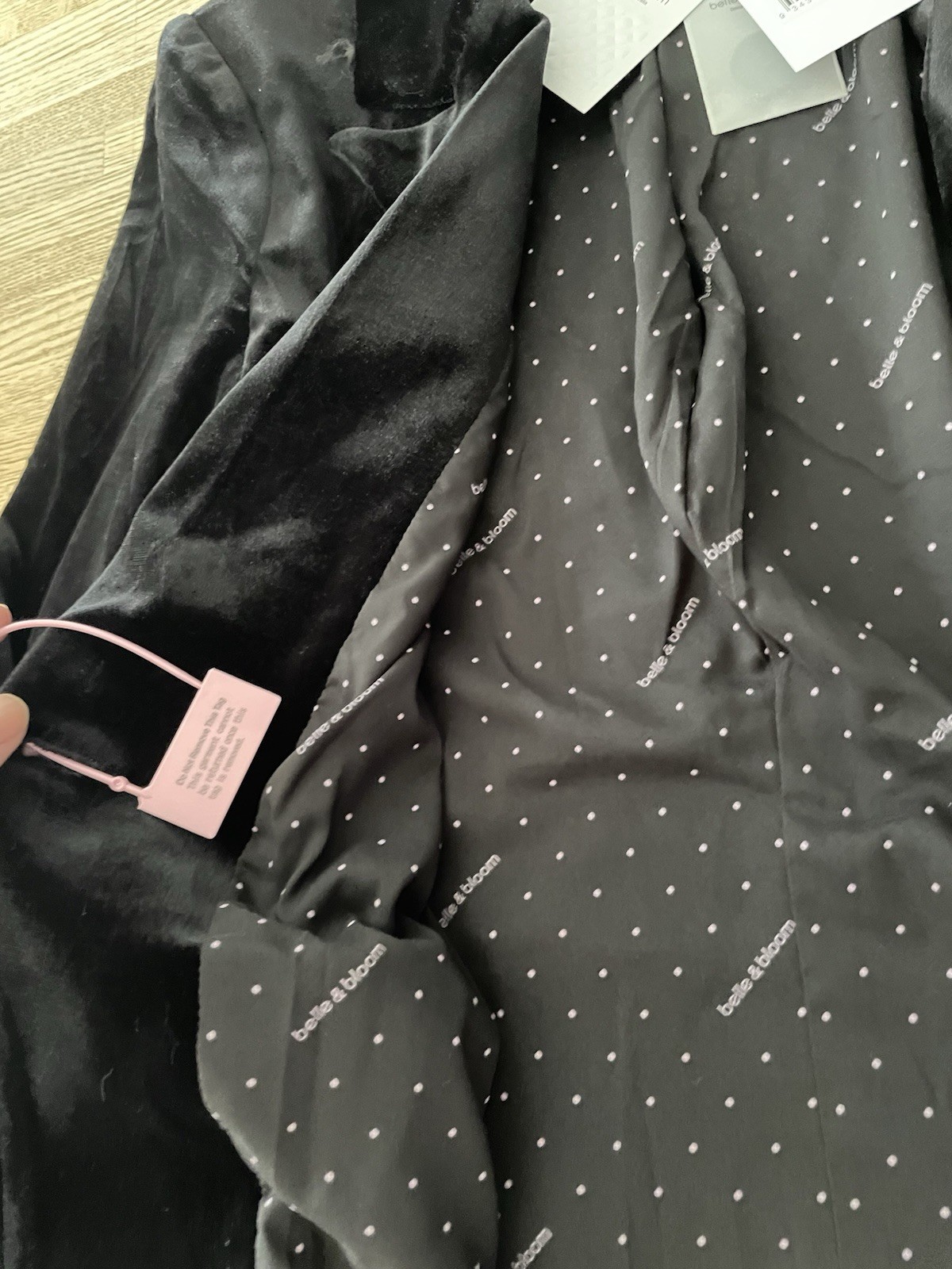 Belle & Bloom Black Velvet Eternity blazer Size small - New with tags and still has return fob Whether worn casual or dressy, the Eternity Velvet Blazer looks opulent and chic in its loose, modern cut. Super chic drape and feel. Fabric: 100% Polyester Lining: 100% Polyester Length: 66cm (size small) Relaxed fit Notch lapel collar Single-breasted closure Side pockets with flap CHECK OUT OUR FILM WARDROBE ITEMS!