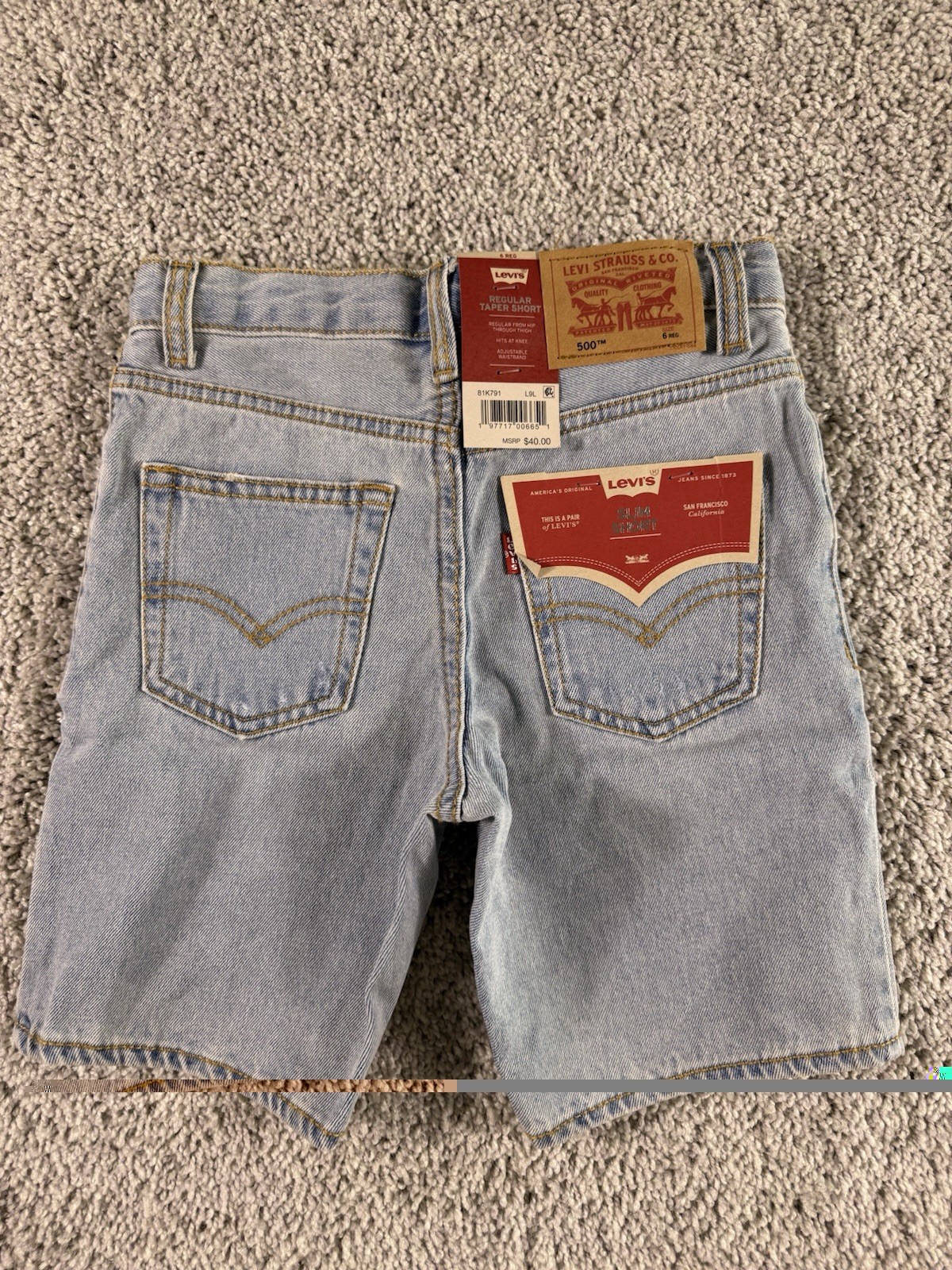 The product is a pair of NWT Boys Levi's Jean Shorts in size 6 regular, featuring a solid blue color and denim fabric. These shorts have a zip closure, light fabric wash, and are machine washable. They are made of cotton and are designed in a regular fit for comfort. The style is a chino, perfect for boys' everyday wear. Made by Levi's, these shorts are a versatile and durable addition to any boy's wardrobe. 4759