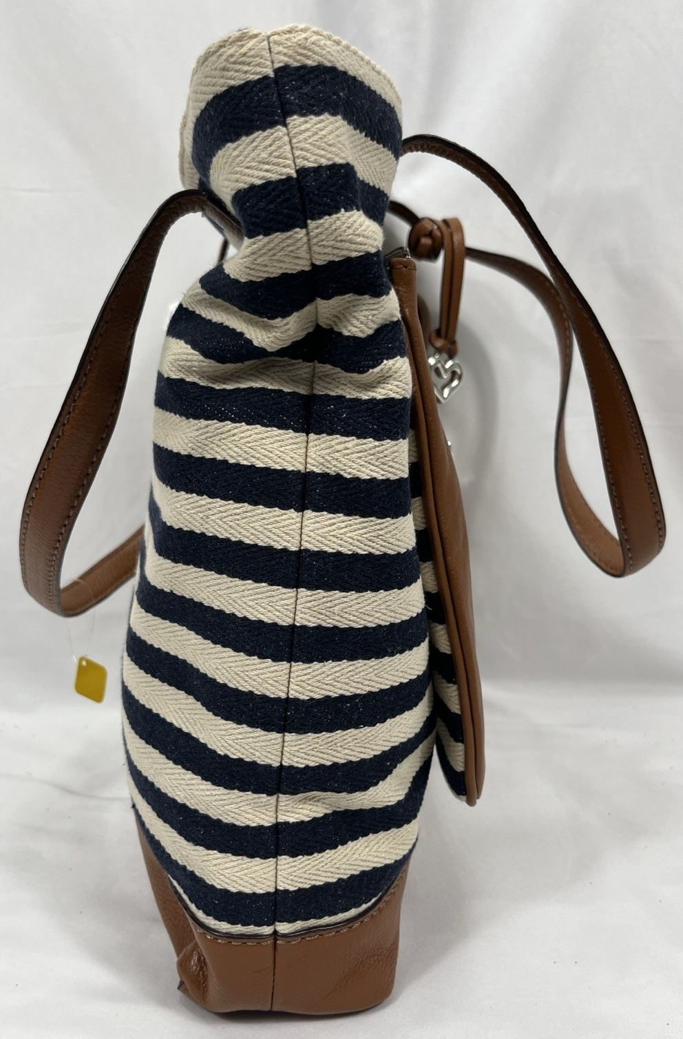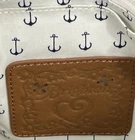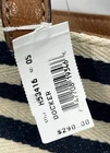 The NWT Brighton Anchor Harbor Tote is a stylish and versatile shoulder handbag made of brown leather and striped canvas. This large tote features a nautical theme with anchor, boat, and starfish accents, making it perfect for travel, beach days, or formal events. With a rectangular shape and double brown leather handles, this bag offers both function and fashion. The interior has four pockets, a mobile phone pocket, and a lightweight, packable design, making it convenient for on-the-go use. Limited edition and featuring a beach, vacation, and nautical character, this tote is a must-have for any fashion-forward woman.