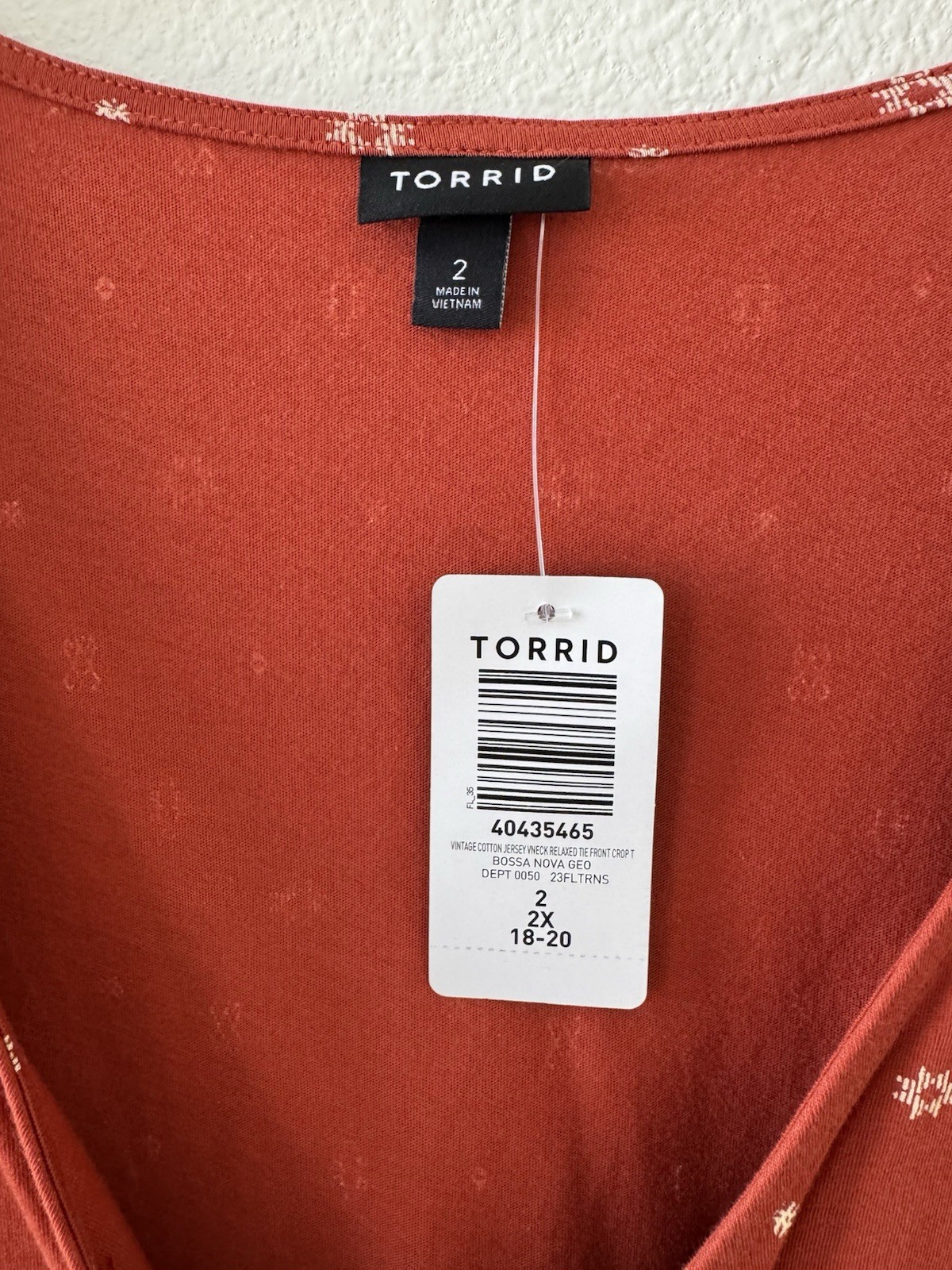 The NWT Blouse in Burnt Orange, size 2X, by Torrid is a stylish and cute summer top perfect for pairing with shorts or jeans. Featuring a bow in the front, short sleeves, and made from cotton fabric, this blouse is both comfortable and fashionable. Ideal for casual occasions or travel, this basic style blouse is a versatile addition to any woman's wardrobe. Available in a vibrant orange color, this blouse is machine washable and designed for plus size women. Perfect for all seasons, this blouse is a must-have for the stylish summer wardrobe.