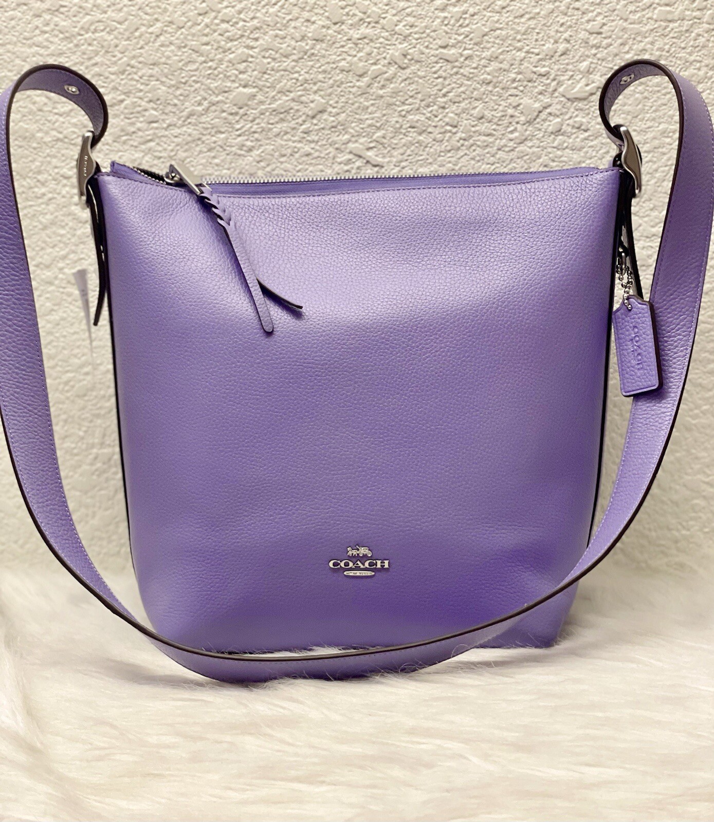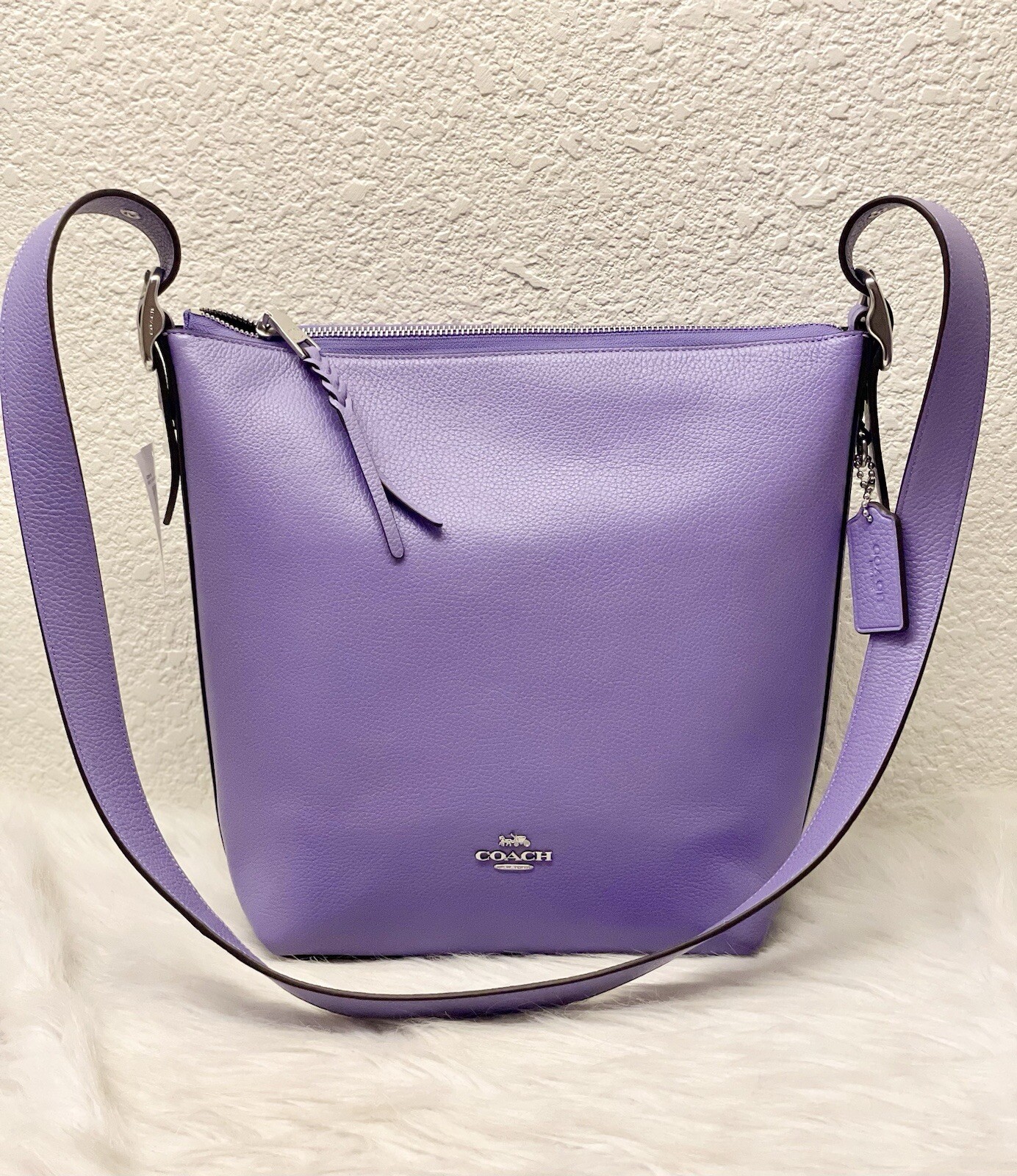 Coach Val Duffle Bag Brand new with tags 100% Authentic Color: Light Violet Product Details Style Number C2818 Measurements Length: 4.5" Height: 9.0" Width: 11.75" Materials Refined pebble leather Fabric lining Strap Adjustable strap with 21" drop for shoulder or crossbody wear Features Outside zip pocket Inside zip pocket, inside cell phone pocket Zip-top closure Inside multifunction pocket Price is firm