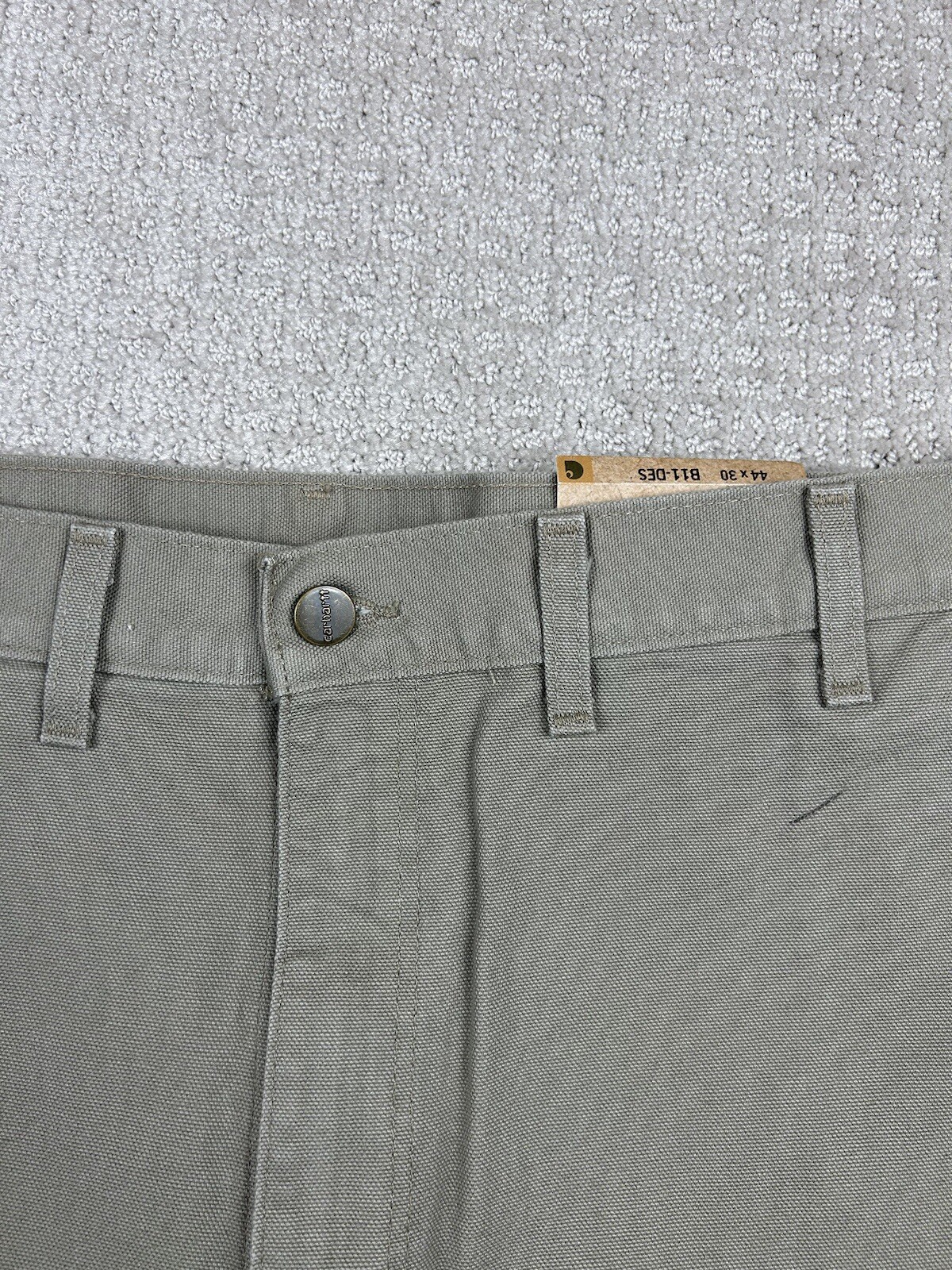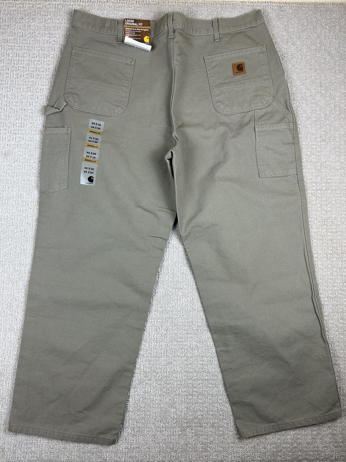 Small black mark on the front from what looks to be a pen. See the photos. Otherwise new with tags condition. Embrace the durability and comfort of Carhartt with these Men's Washed Duck Work Dungaree Pants in a versatile beige. Designed for the demanding workplace and beyond, these pants feature a robust cotton canvas construction, ensuring they stand up to the rigors of daily wear while maintaining a relaxed fit for all-day ease. Size 44 with a 30-inch inseam, these carpenter-style pants offer ample space for movement and are tailored to fit seamlessly into the regular size profile. Adorned with the classic Carhartt logo and a grunge-inspired theme, they marry functional appeal with a touch of casual style. Whether it's for work or casual wear, these pants are a testament to the fusion of utility and trend.