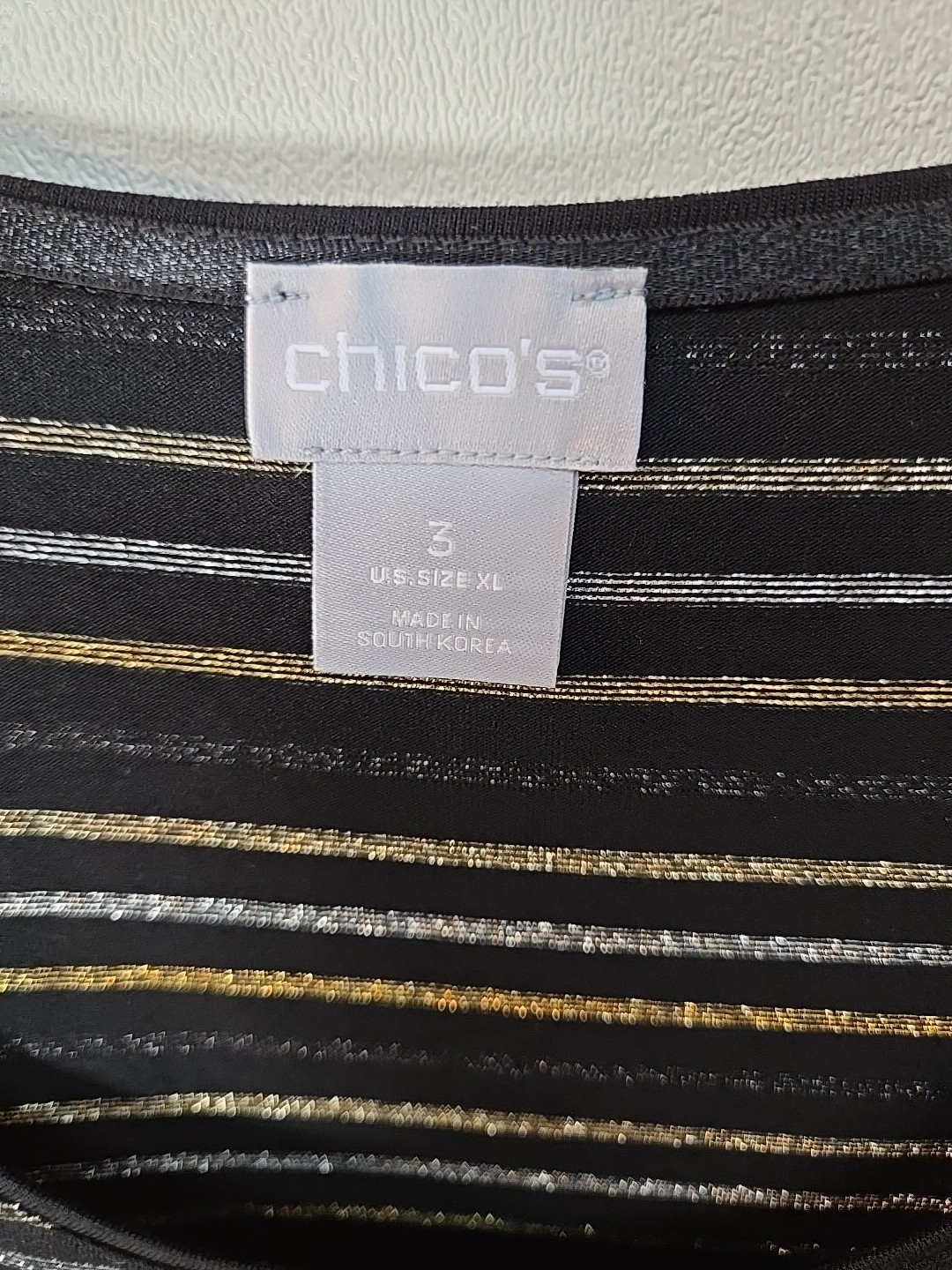 This NWT Chico's top in size 3 XL is a stylish black pullover shirt with silver and gold metallic stripes, making it perfect for a party, workwear, or business occasion. The scoop neck and long sleeves add a touch of elegance to the lightweight and stretchy knit fabric, suitable for all seasons. Machine washable and featuring a regular fit, this blouse from Chico's is a versatile and chic addition to any woman's wardrobe. New with tags Rayon, Spandex, Other Machine Wash Cold Stretch Please see photos for measurements and details :)