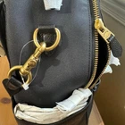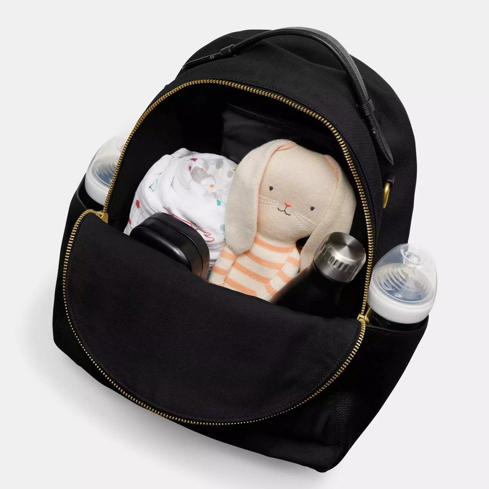 Brass/Black Style Number 99290 Measurements Length: 13.5" Height: 13.5" Width: 5.5" Materials Nylon and polished pebble leather Fabric lining Handle Top handle with 2" drop Strap Adjustable shoulder straps Two stroller attachment straps Features Outside open pocket,Outside zip pocket Inside zip pocket Inside multifunction pocket Zip-top closure Removable zip pouch Changing pad included