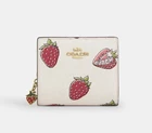 NWT Coach CAP18 Snap Wallet With Strawberry Print In Gold/Chalk Multi 100% Authentic Limited Edition Style Number: CAP18 Measurements Length: 4.25" Height: 3.5" Width: 1.0" Materials Printed coated canvas Features Outside zip coin pocket Three credit card slots Snap closure Full-length bill compartment Additional Details ID window Note: The strawberry patterns were randomly arranged
