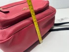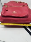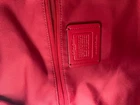 The NWT Coach F30550 Medium Charlie Backpack in True Red is a stylish and versatile handbag made of pebbled leather. It features a zip closure, black leather handles/straps with an adjustable drop, and a gingham pattern accent. The bag has a medium size with a width of 9 inches, depth of 4 inches, and length of 10 3/4 inches, making it the perfect accessory for everyday use. The interior lining is a combination of leather and fabric in a red color, adding a pop of color to the overall design. This Coach backpack is a must-have for any fashion-forward woman looking for a chic and practical accessory.
