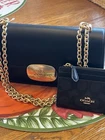 Absolutely beautiful and classic coach duo. This includes one coach, Eliza, black leather Crossbody bag. Paired with a coach black logo small ID wallet. Both new with original tags. Retail over $500 including tax. Great buy it now price. Bag measures 9 inches wide, 4.75 inches high. 2.25 inches deep. Chain strap can be used as a Crossbody or doubled as a shoulder bag. Measures 22 1/2 inches of a drop. Note: bag has a small approximately one inch imperfection on the front flap. See photos This is a gorgeous and classic coach set for yourself or as a gift for that special someone in your life. 💕