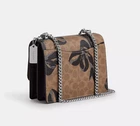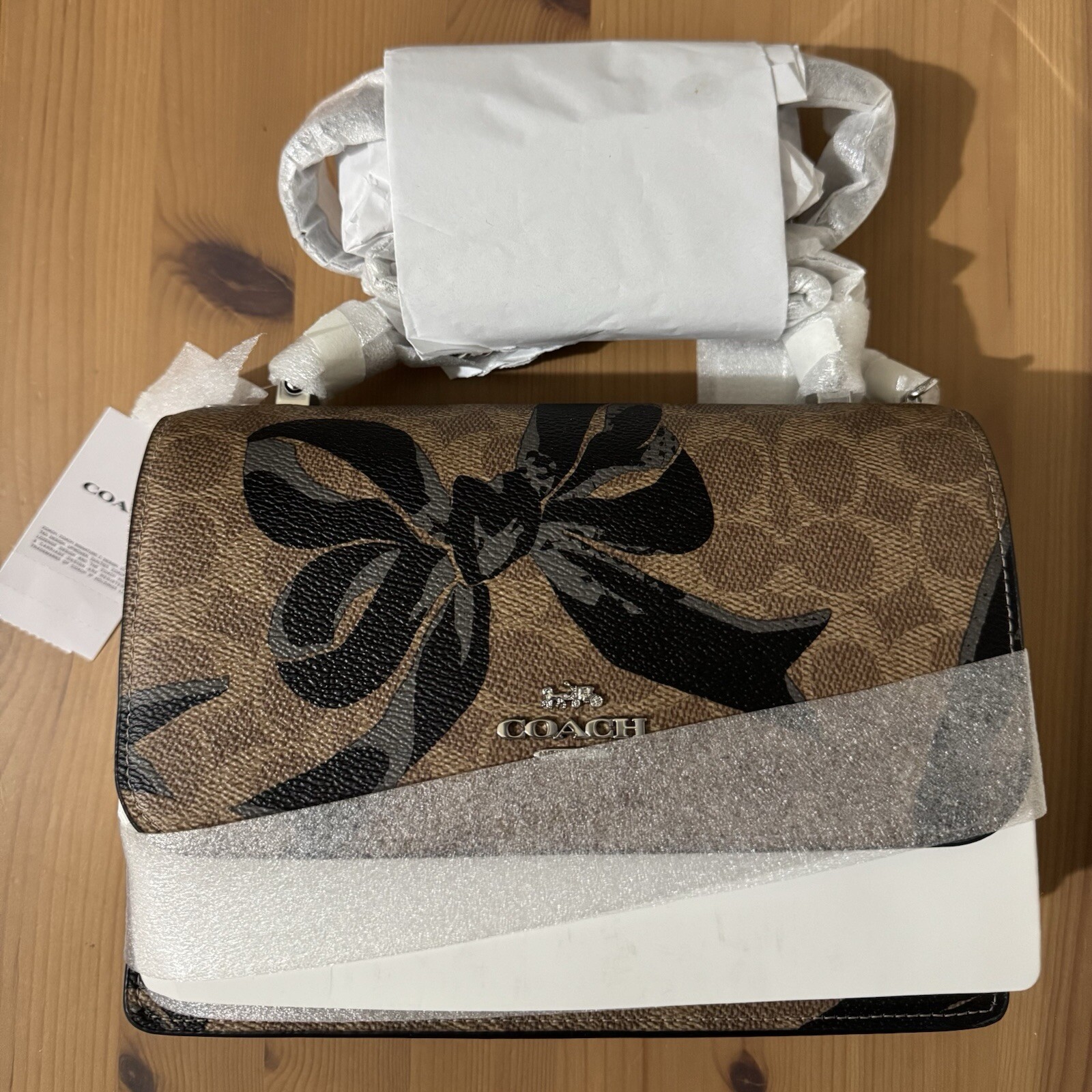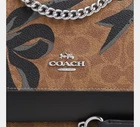 Placement of the bow print may vary Product Details Style Number CY649 Measurements Length: 8.5" Height: 6.25" Width: 2.75" Materials Signature coated canvas and smooth leather Fabric lining Strap Silver/Tan/Black Multi Strap with 22" drop doubles up for three ways to wear: short or long on the shoulder or crossbody style Features Outside slip pocket Inside zip and multifunction pockets Snap closure