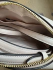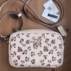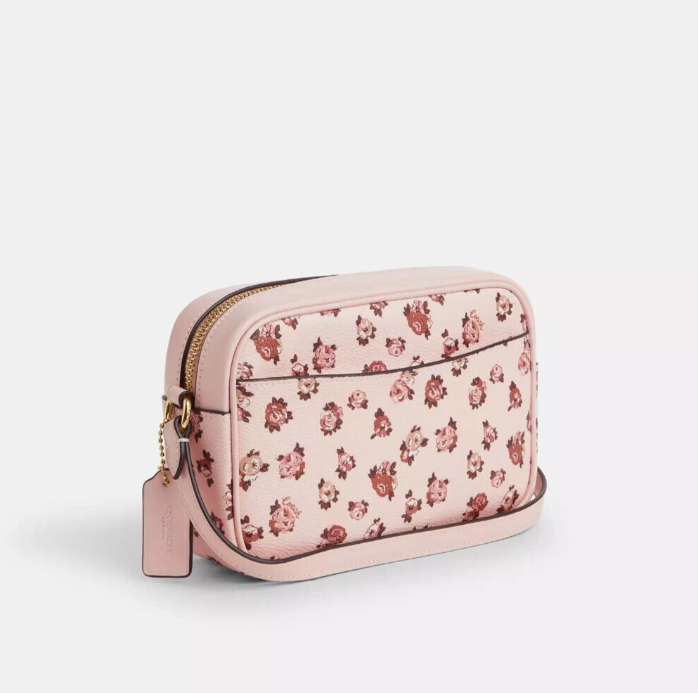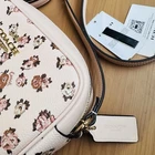 Gold/Blush Multi Style Number CY780 Measurements Length: 7.75" Height: 5.0" Width: 2.25" Materials Printed coated canvas and smooth leather Fabric lining Strap Adjustable strap with 22.5" drop for shoulder or crossbody wear Features Outside open pocket Inside snap pocket Two credit card slots Zip closure