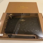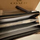 Style Number CF464 Measurements Length: 7.5" Height: 4.0" Width: 1.0" Materials Signature smooth calf leather and smooth leather Strap Detachable wrist strap Includes interchangeable strap with charm Detachable wrist strap Features Inside zip coin pocket 12 credit card slots Zip-around closure Full-length bill compartments Additional Details Packaged in a Coach gift box with ribbon