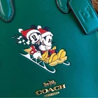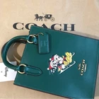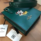 Brass/Dark Pine Refined calf leather Two credit card slots Magnetic snap closure, fabric lining Handles with 2 1/4" drop Detachable strap with 23 1/4" drop for shoulder or crossbody wear 5 1/2" (L) x 6 3/4" (H) x 2" (W) Disney x Coach ©Disney Style No. CN021