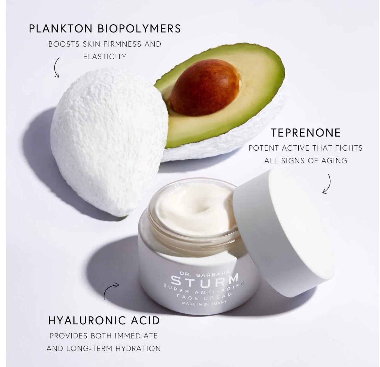 NWT Authentic Sealed Fresh Dr. Barbara Sturm Super Anti-Aging Face Cream 1.7 Oz $360 2025 Highlights: Good for: Anti-Aging Good for: Loss of firmness Cruelty-Free Hyaluronic Acid Fragrance Free About the Product: What it is: A scientifically advanced moisturizer that delivers rapid and long-term results, visibly plumping up wrinkles and promoting firmer, more supple skin. Skin Type: Normal, Dry, Combination, and Oily Skincare Concerns: Fine Lines and Wrinkles, Dryness, and Loss of Firmness and Elasticity Formulation: Rich Cream Highlighted Ingredients: - Plankton Biopolymers: Support firm, supple skin. - Meadow Knotweed Extract: Restores visible radiance. - High-Concentration Short- and Long-Chain Hyaluronic Acid Molecules: Intensely hydrate, reducing the appearance of fine lines and wrinkles. Ingredient Callouts: This product is gluten-free, cruelty-free, and comes in recyclable packaging. What Else You Need to Know: Dr. Barbara Sturm created this cream with a unique biomimetic formulation that visibly strengthens the natural skin barrier and deploys potent ingredients to support visible age-diminishing physiological mechanisms in the skin. As an aesthetic doctor with a background in anti-inflammatory medicine, Dr. Sturm is committed to treating the skin with scientifically-proven ingredients and non-aggressive natural extracts. The three pillars of Dr. Barbara Sturm Molecular Cosmetics—hydration, boosting the skin’s natural barrier function, and reducing the visible signs of irritation—help to promote healthy skin that glows from within over time.