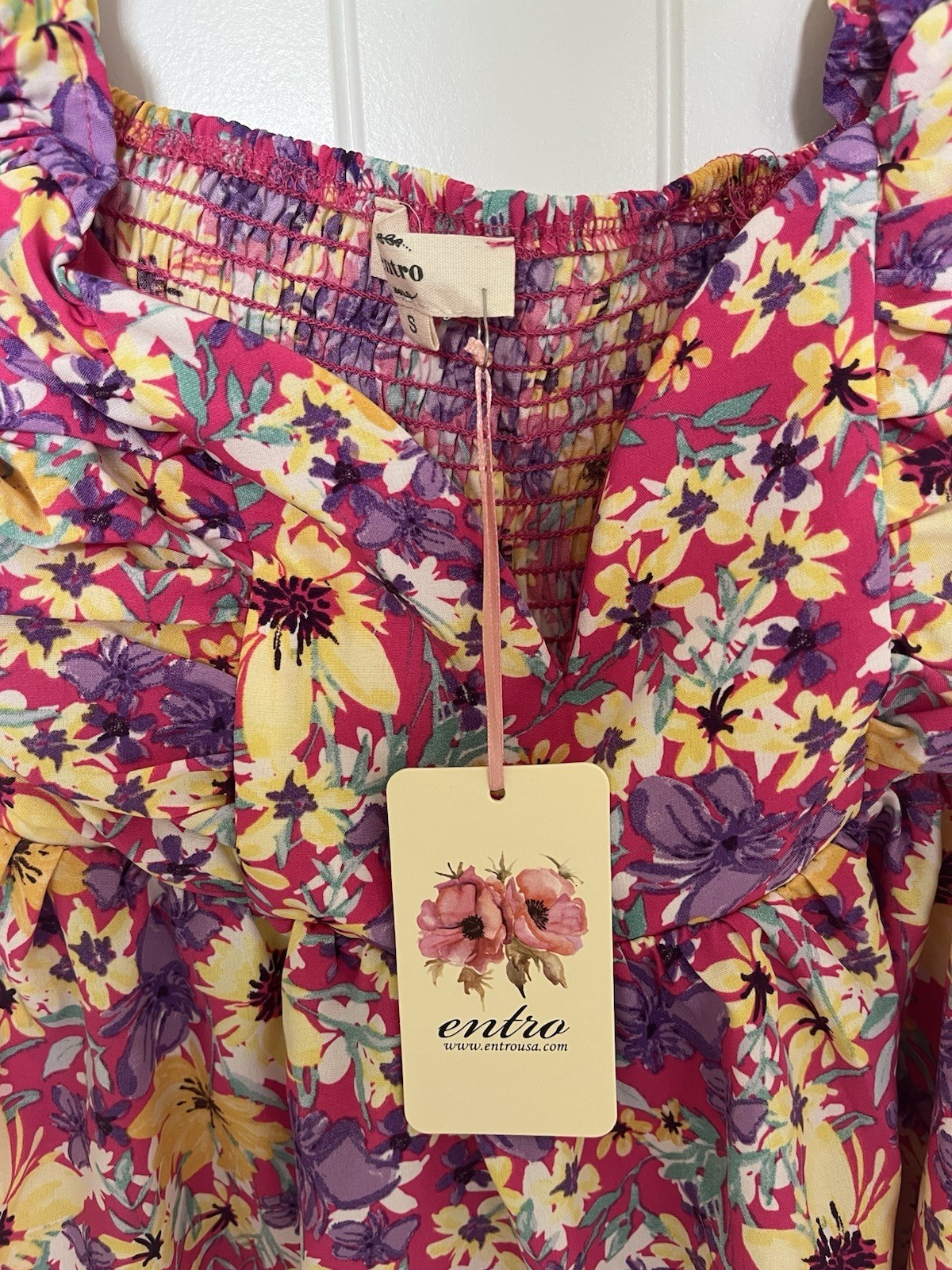 Gorgeous floral top with a feminine sweetheart neck line. It’s full length, would pair great with skinny or flared jeans.