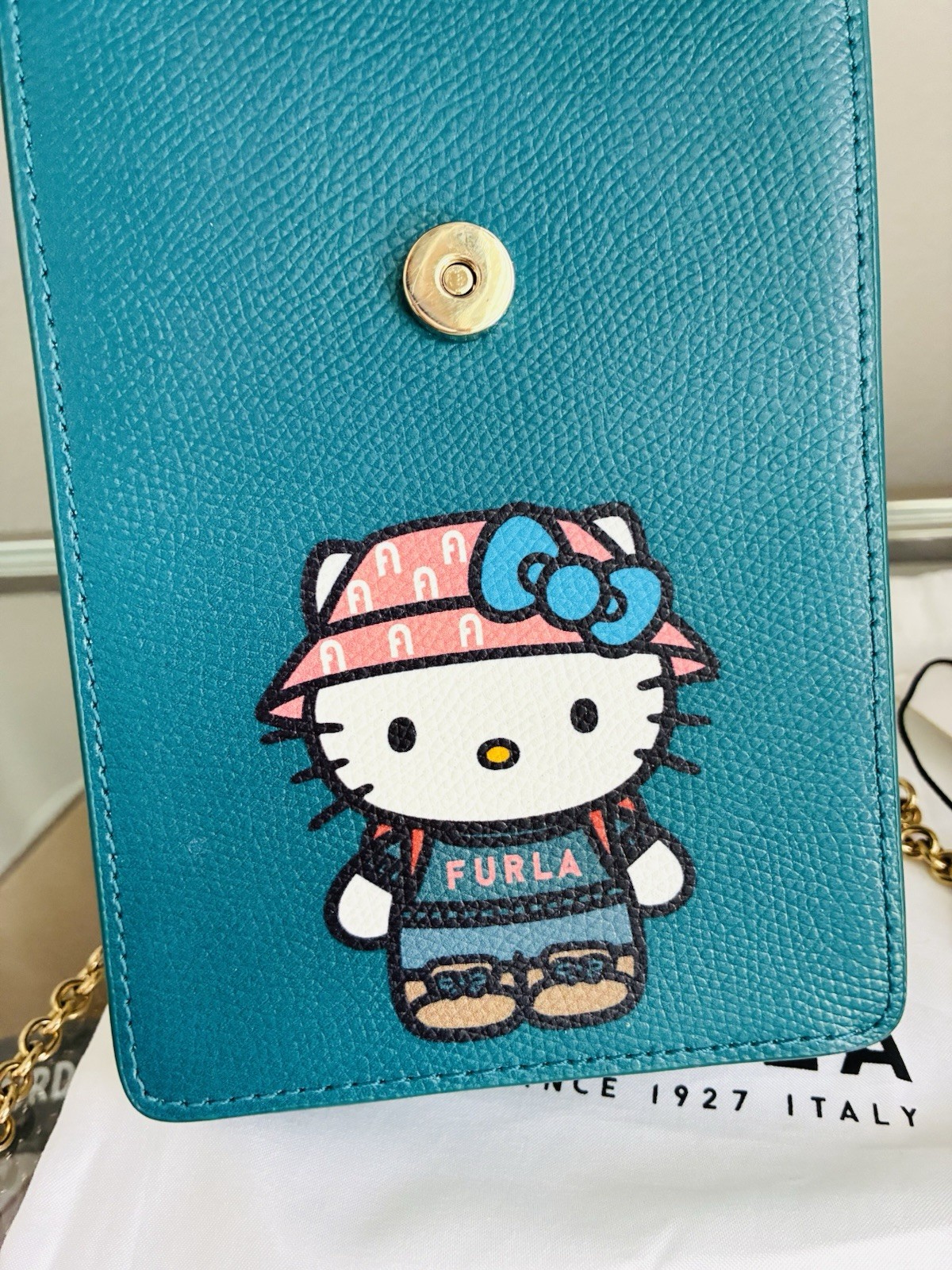 β¨ Add a pop of fun to your collection with this exclusive Furla x Hello Kitty limited edition chain crossbody bag! This unique piece showcases Furlaβs renowned Italian craftsmanship paired with the playful charm of Hello Kitty. Featuring a vibrant design with Hello Kitty in a whimsical outfit, surrounded by adorable polka-dotted mushrooms, this bag is perfect for collectors and fashion lovers. Made from premium leather, it includes a detachable gold-tone chain strap for versatile styling. π Condition: New With Tag (NWT), come with dust bag. Color: Forest green π³ Dimensions: β’ Height: 6.3 inches (16 cm) β’ Width: 4.3 inches (11 cm) β’ Depth: 1.2 inches (3 cm) β’ Strap Drop: Detachable gold chain strap for shoulder or crossbody wear, approx. 22 inches (56 cm) when worn crossbody. Features: β’ Magnetic snap closure for secure storage. β’ Interior slip pocket for essentials. β’ Signature Furla logo embossing and branding. Ideal for everyday use, special outings, or as a standout addition to your wardrobe! This rare Furla x Hello Kitty collaboration, established since 1927, is a must-have. Secure this unique piece today!