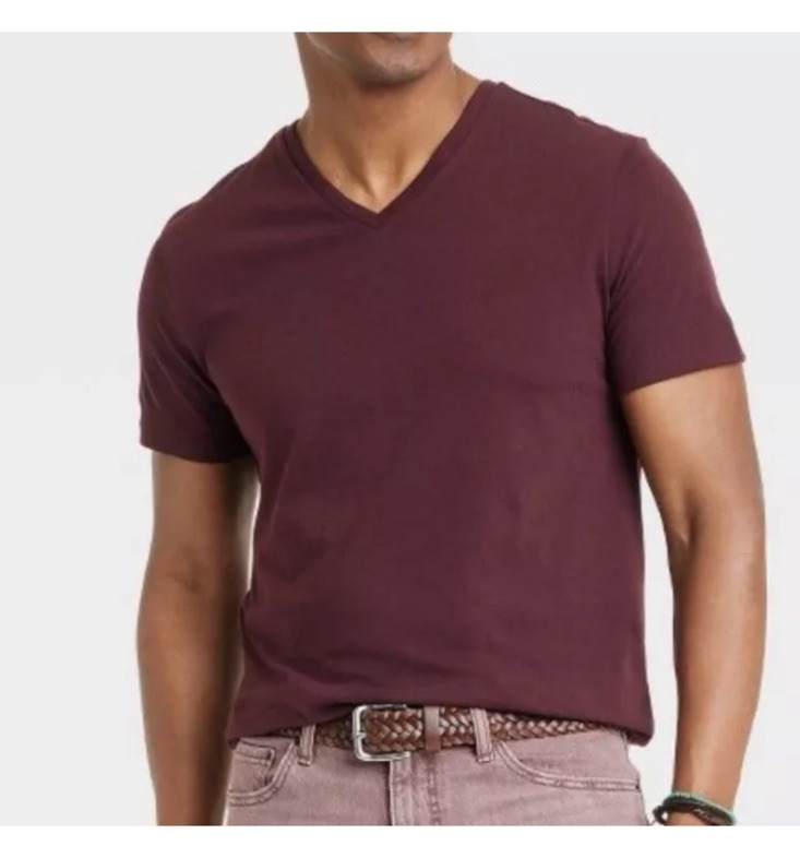 The Goodfellow & Co men's T-shirt is designed with a classic V-neck and short sleeves, offering a regular fit in size Large. The shirt is a solid red color, made from a blend of polyester and cotton materials. This versatile piece from Goodfellow & Co is a stylish and comfortable addition to any men's wardrobe, perfect for casual wear.